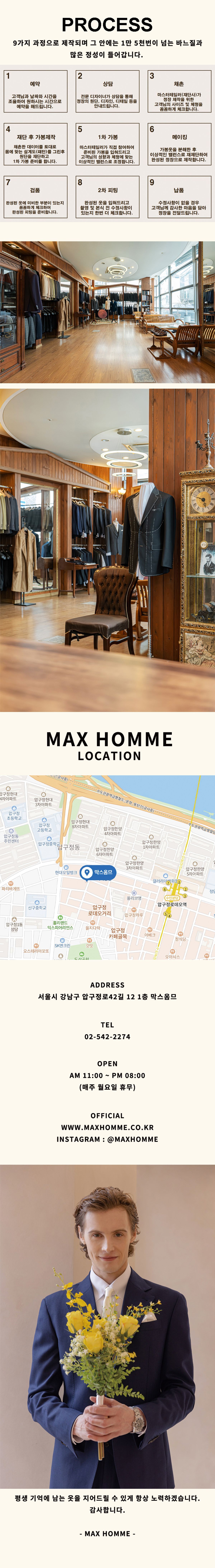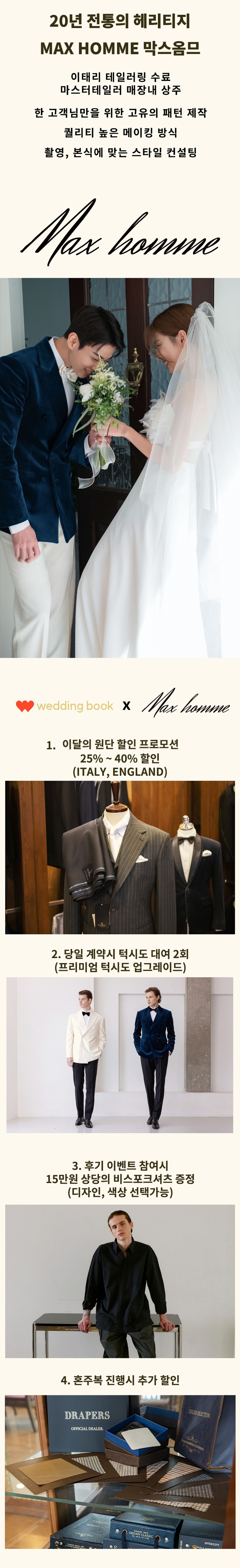 ✔️ 기간 : 12월 1일(월) ~ 12월 31일(수) ✔️ 웨딩북 앱 예약 혜택 💝 상담 진행 시 고급 넥타이 증정 ✔️ 계약 혜택 - 원단별 할인 혜택(최대 40% 할인) - 프리미엄 턱시도 2회 대여 - 촬영, 본식 장소에 어울리는 스타일링 제공 - 대여복에 어울리는 니트, 로퍼 등 필요한 악세사리 무상 대여 - 턱시도 리폼 서비스 무료 제공 - 맞춤 진행시 고급 행거칩 무료 증정 - 맞춤 진행 시 고급 넥타이 무료 증정 - 비스포크 셔츠 이니셜 각인 무료 - 리뷰 이벤트 참여 시 15만원 상당의 비스포크셔츠 제작(이니셜 가능)