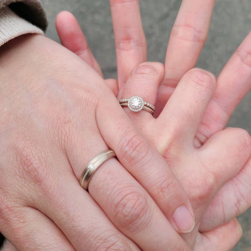 너무 예뻐요:) 아래 후기와 사진으로 감상하셔요~ 디자인 : 추천♥ 보는 사람들마다 어디서 했냐고 물어봤던 소그노 예물반지. 종로나 논현동 예물거리 투어할 때 뭔가 아쉬움이 조금씩 있었는데 소그노 방문하고 그 자리에서 계약해 버렸지요. 화동어린이와 예물교환을 식순에 꼭 넣고 싶을 정도로 만족스러웠던 밴드입니다:) 인터컨티넨탈 코엑스에서 식을 했는데 호텔의 분위기와도 너무 잘 어울려서 더 행복했습니다. 프로포즈 할 때, 친구 결혼식 부케 받을 때, 청첩장 줄 때도 어김없이 저희와 함께한 웨딩밴드. 디자인이 참 클래식하면서 독특해 특별한 자리에서도 빛이 나지만 그렇다고 너무 화려하고 튀지는 않아 청바지에 반팔차림, 일상복에도 너무 잘 어울린답니다. 품질 : 추천♥ 웨딩촬영 때도 작가님께서 반지가 너무 예쁘다고 반지샷만도 많이 찍어주시고, 식 당일에도 부케에 얹어서 예쁘게 찍어 주시더라구요. 평생 간직할 반지라 정말 많은 샵을 돌아다니고 신중하게 골랐습니다. 커플마다 어울리는 분위기의 반지가 있는 것 같아요. 저희는 편안하고 따뜻한 느낌을 주는 부부가 되고 싶었고 그런 분위기와 찰떡같이 어울리는 반지를 만나서 참 행복합니다. 마지막으로 제가 결혼식 끝나고 다이아 보증서와 영수증을 다 분실해 너무 속상했는데, 보증서도 다시 발급해 주시고 꼼꼼하게 다시 서류들 준비해주셔서 너무 감사했습니다. 나중에 폴리싱하러도 가고 또 다른 악세사리들 구경도 하고 싶어요. 삼청동 들르면 또 데이트하러 갈게요:) 서비스 : 추천♥ 일처리를 매우 빠르게 해주셔서 감사했습니다:)