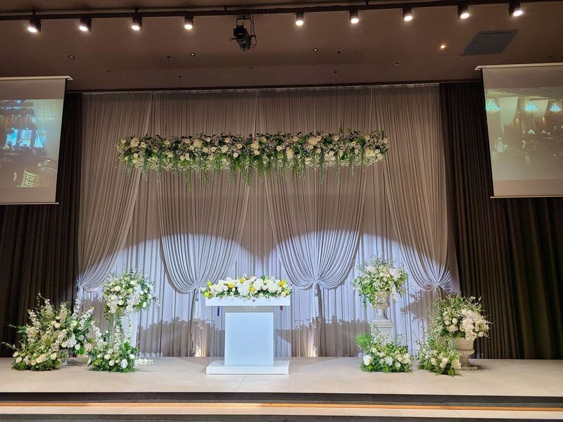 사이즈가 다른 홀 2개가 각각 다른 층에 있는 점은 좋았어요. 건물 내에 주차장이 있는 것도 좋았지만, 예식 홀까지 가는 엘리베이터를 다른 상가들하고 같이 사용해야해서 조금 복잡했어요. 건물이 오래된 느낌도 있었구요. 최종 선택은 하지않았지만, 가격적인 면에서는 그래도 괜찮았던거 같아요. 홀분위기 : 보통♥ 전형적인 분위기의 웨딩홀이에요. 꼭 어떤 스타일이이어야만 한다! 라는게 없으신 분들한테는 무난 할 거 같아요! 음식 : 시식은 못해봤지만, 부페가 아닌 한상차림으로 나온다는 점에서 호불호가 갈릴거 같아요. 제 개인적으로는 식대가 싼 것도 아닌데 한상차림은 별로였어요. 서비스 : 추천♥ 안내해주시는 직원분들은 친절하셨어요! 음향, 조명까지 다 틀어주시고 세세하게 안내 해주셨어요.