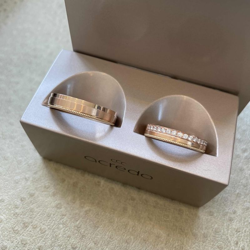 평소에 둘다 ‘웨딩밴드로 너무 흔한 디자인은 하지 말자’ 위주였때문에 선택한 브랜드가 아크레도였어요~ 커스터마이징이 이렇게 재밌을 줄 몰랐는데 정말 방문해서 정확히 두시간 꽉채워서 상담/계약까지 완료했습니다! 취향을 그대로 반영한 우리만의 웨딩밴드라서 의미도 남다르게 느껴졌던것같아요~ 2개월반?정도 뒤에 수령하기로 했는데 얼른 받아서 껴보고 싶어요~ 사진은 저희 커플이 디자인한 반지는 아니지만 이런 느낌으로 커스터마이징을 했기때문에 첨부해 봅니다~! 디자인 : 추천♥ 신랑,신부가 직접 두께,색상,디자인을 선택하여 커스터마이징 할수 있어서 나만의 웨딩밴드로 너무 좋았어요~~ 품질 : 추천♥ 품질대비 가격적인 면에서 타 브랜드들보다 훌륭하다고 생각합니다! 독일 세공이라 세공력은 이미 검증된 셈이구요~ 무엇보다 평생 무료 폴리싱이 가능하다는 점이 제일 끌렸던 것 같아요~ 추후에 사이즈때문에 재 제작할 경우 원 반지 가격의 20%(공임비)만 지불하면 완전 새 반지를 받는 점도 장점인것 같습니다~ 서비스 : 추천♥ 방문해서부터 나올때까지 한 열개 이상의 반지를 껴 본것 같아요! 일단 저희 커플은 둘다 결정장애가 심한지라..그 부분을 딱 캐치하시고 신랑,신부 모두가 만족해 하는 웨딩밴드를 고를수 있게 진짜 세심하게 도와주셔서 너무 감사했어요~