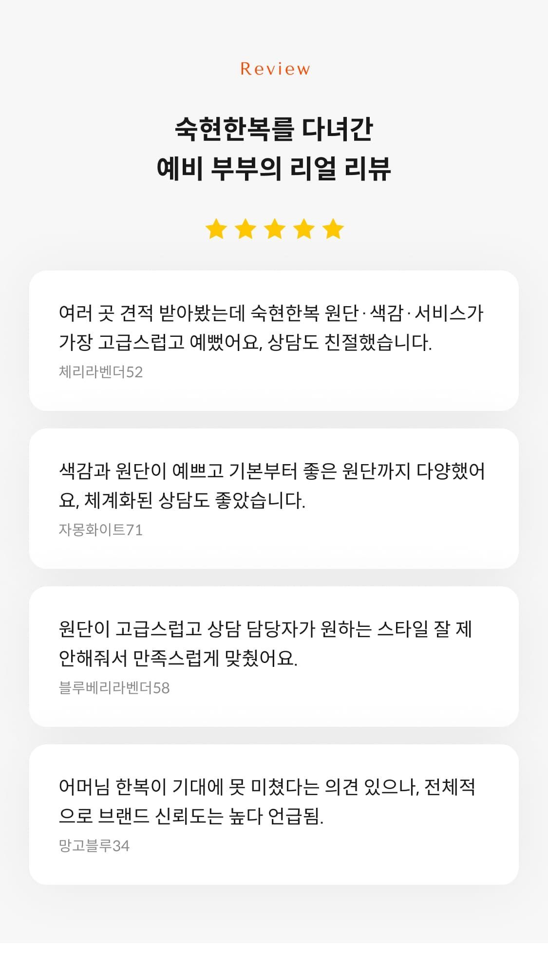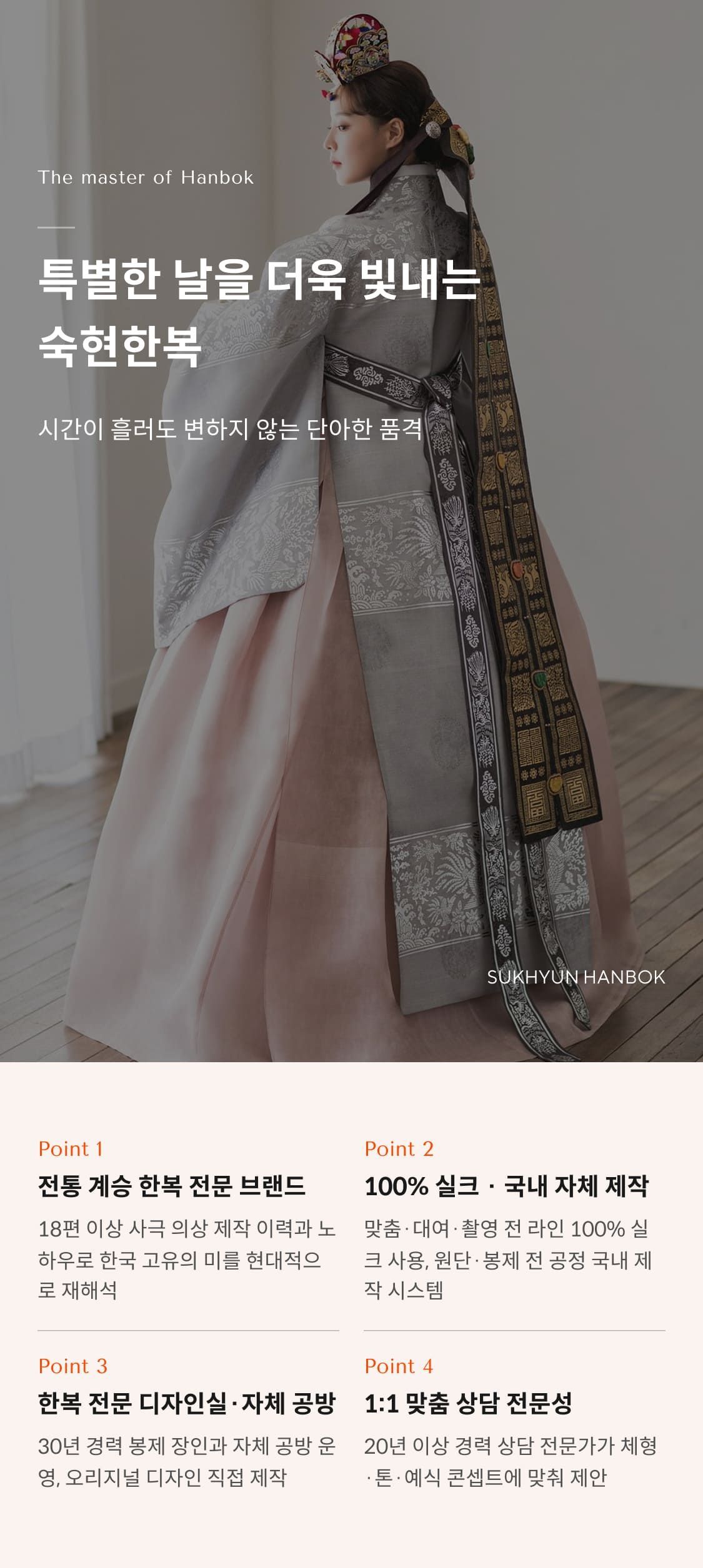 1. 맞춤, 대여, 촬영 대여까지도 전부 100% 실크만을 사용 2. 원단, 원사, 바느질 모두 국내 제작 3. 20년 이상 경력의 맞춤 상담 전문가 4. 30년 이상 경력의 봉재 전문가 및 자체 공방 운영 5. 한복 전문 디자이너 및 자체 디자인실 보유 6. 층별 특화된 공간에서 편안한 상담과 서비스 제공 7. 18편 이상의 국내 사극드라마 최다 의상 제작