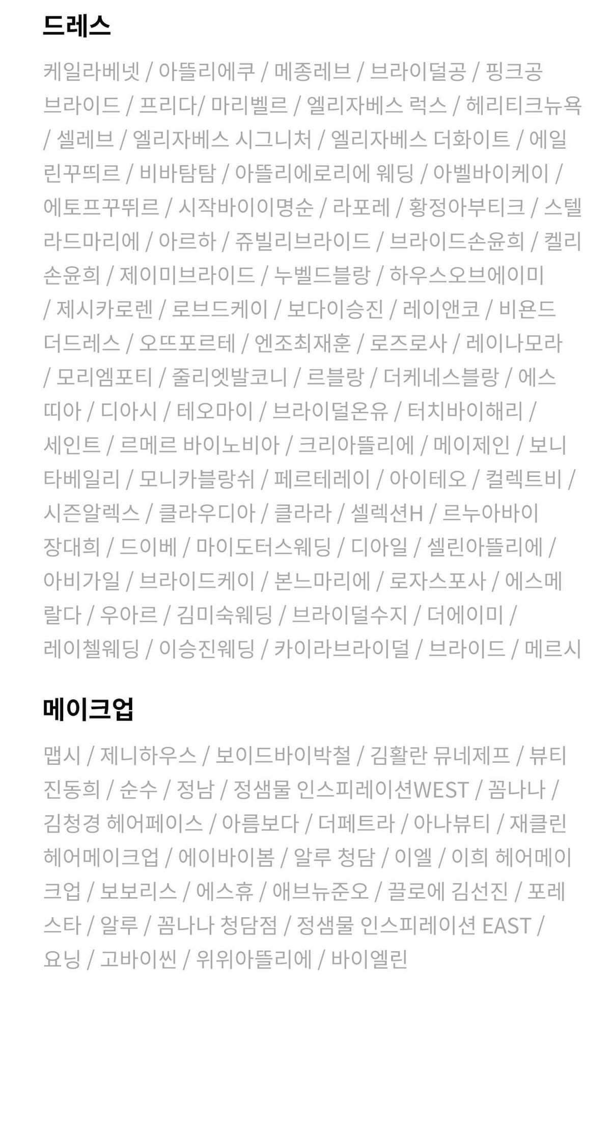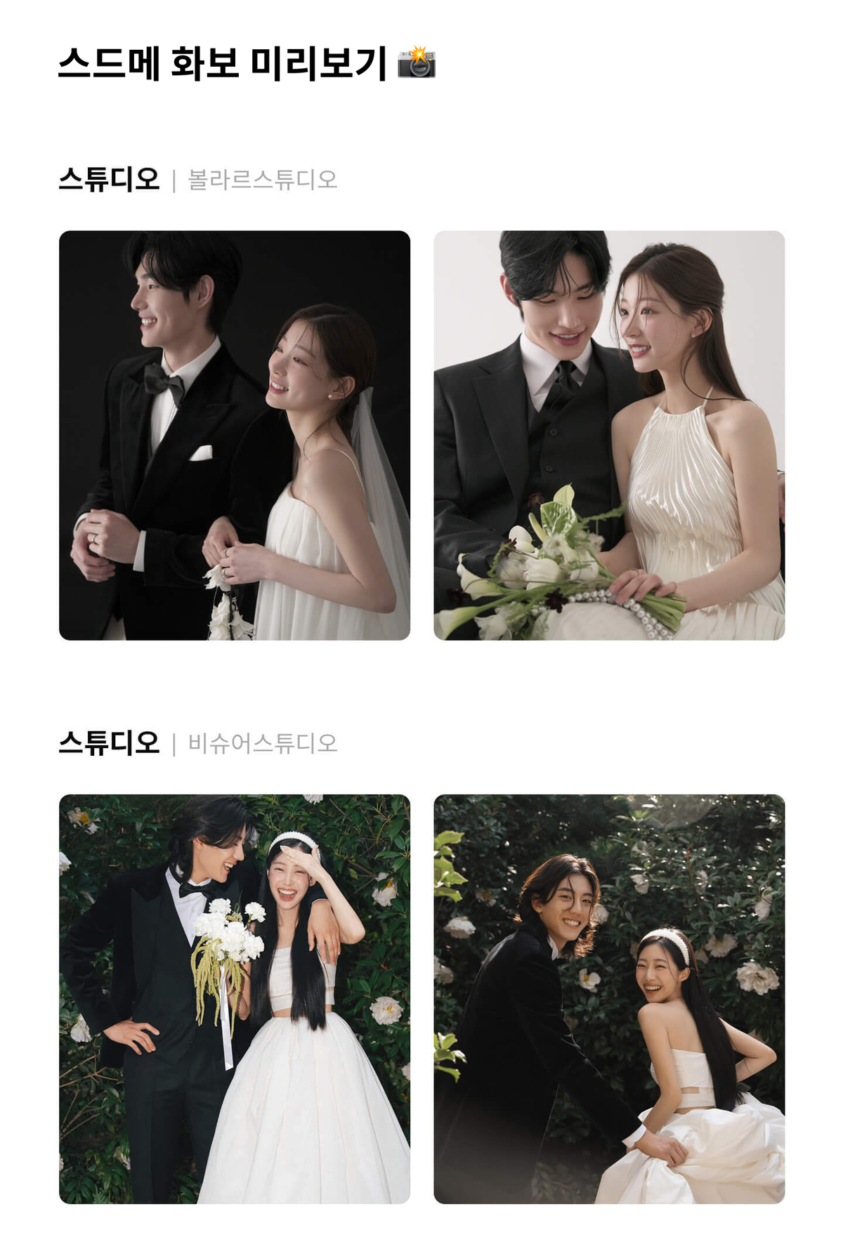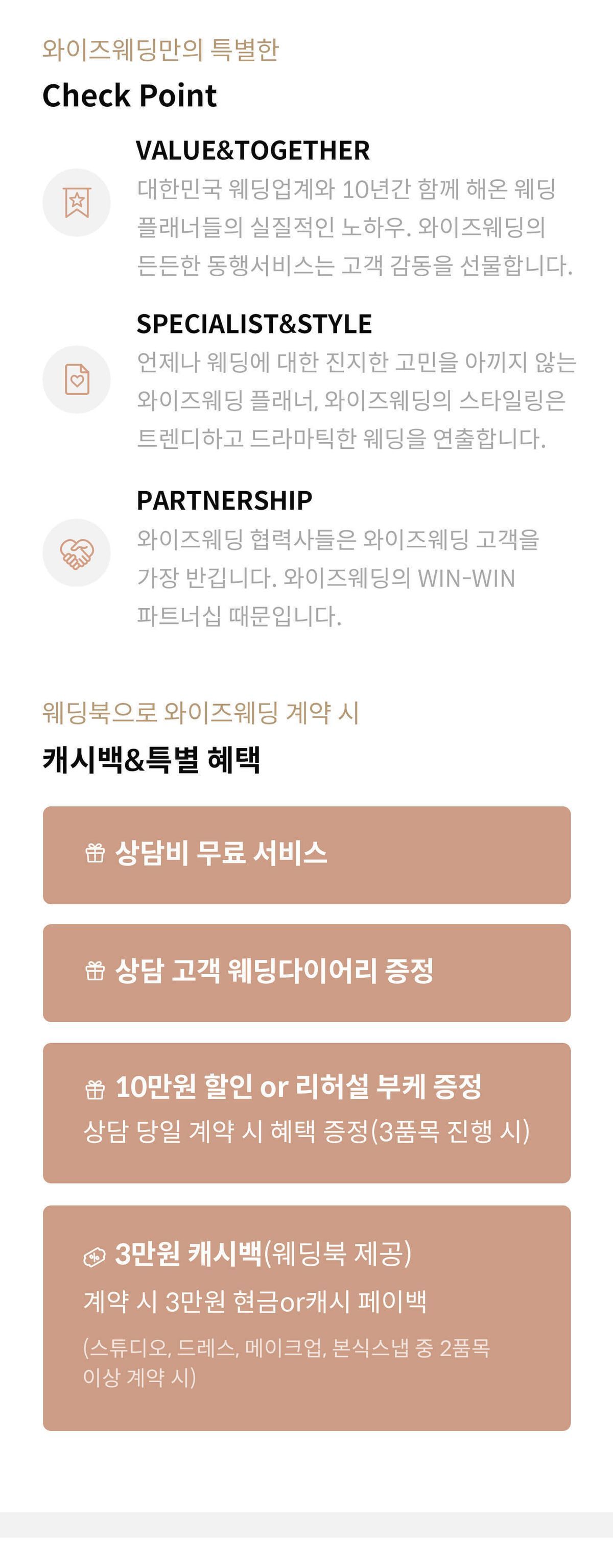 웨딩패키지 품목에는 스튜디오/드레스/메이크업/본식스냅이 해당됩니다. 품목 중 하나만 계약한 경우 혜택은 지급되지 않습니다.
