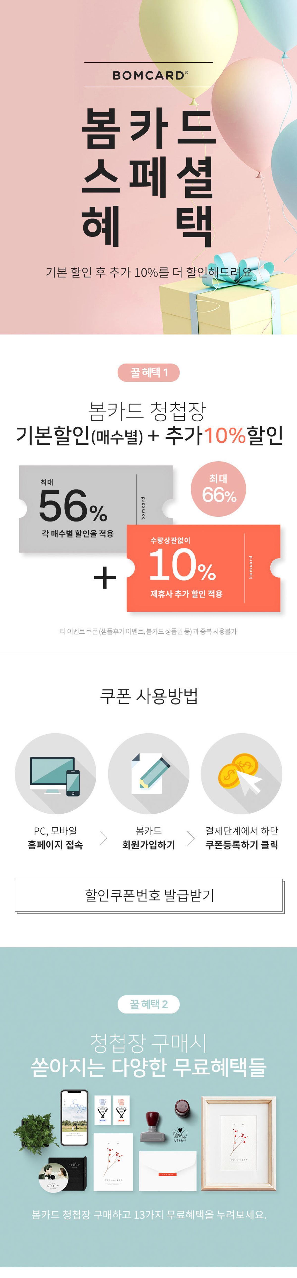✓ 봄카드 홈페이지 접속(http://bom-card.com) ✓ 회원 가입 후 로그인 ✓ 원하는 청첩장 주문하기 진행 ✓ 결제단계에서 쿠폰번호 등록 및 쿠폰 사용