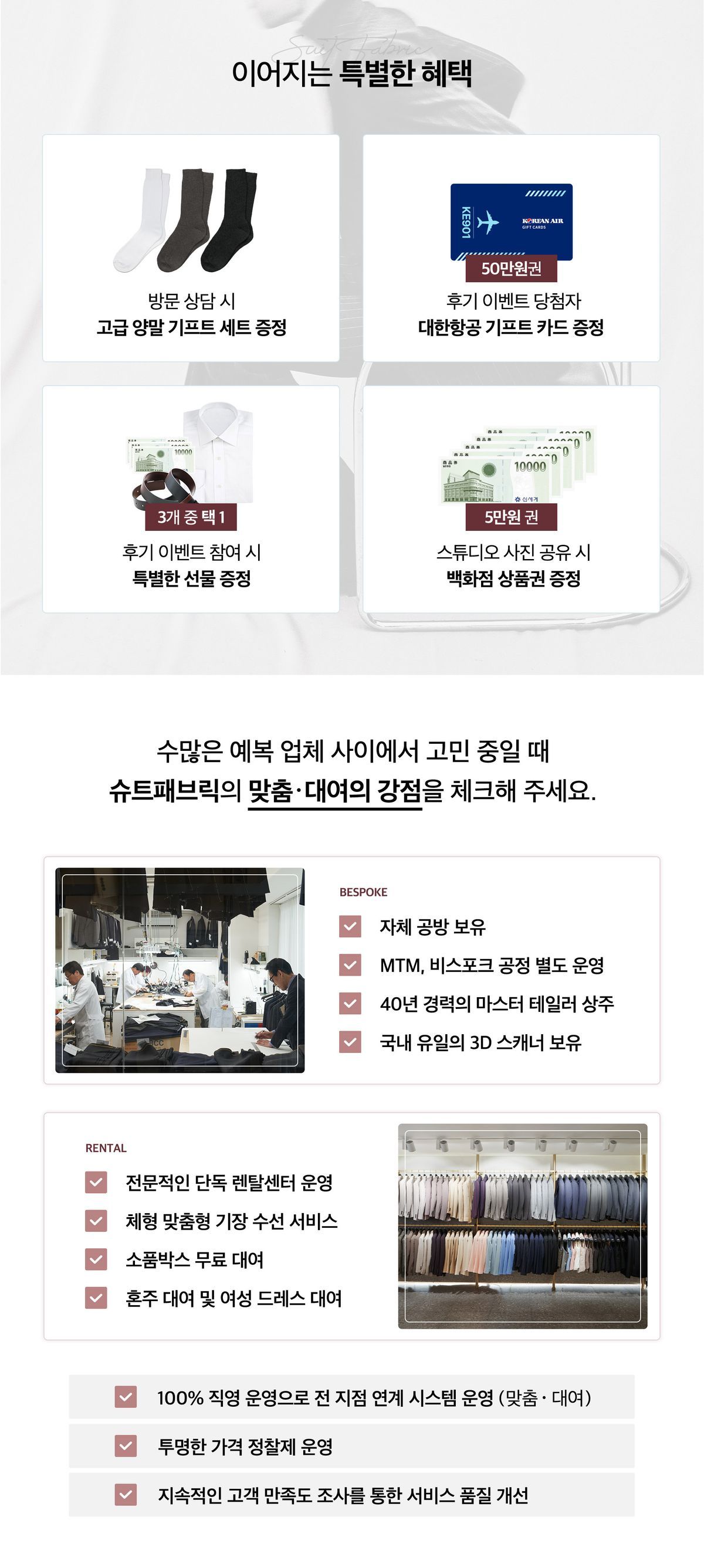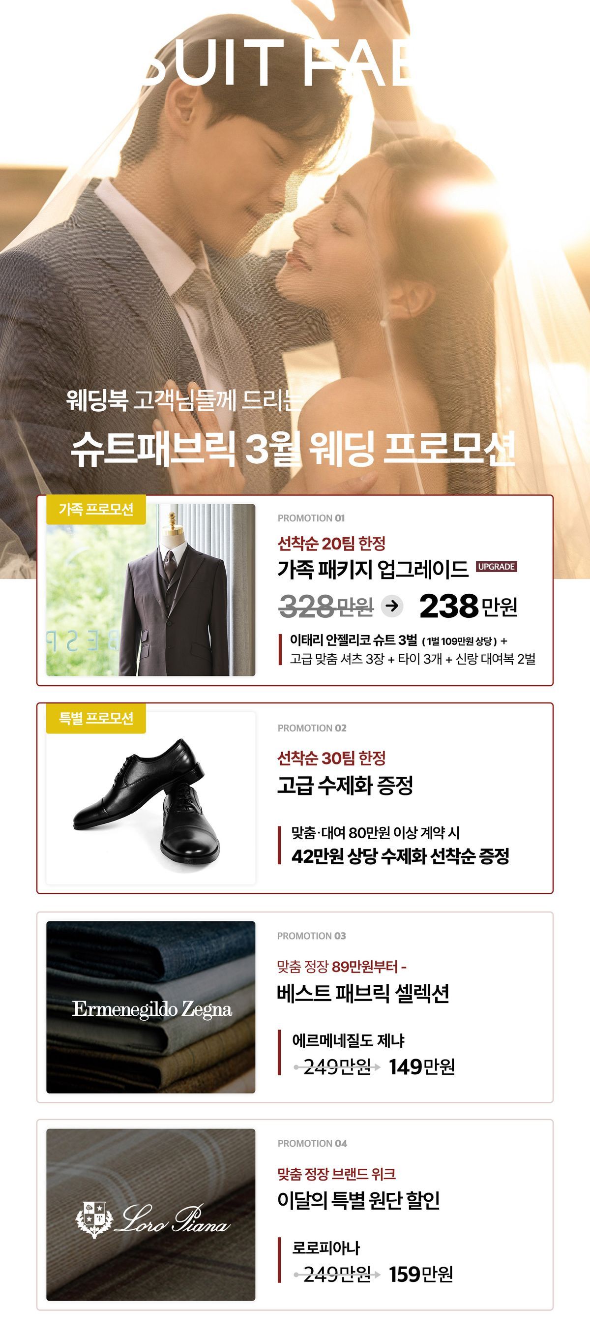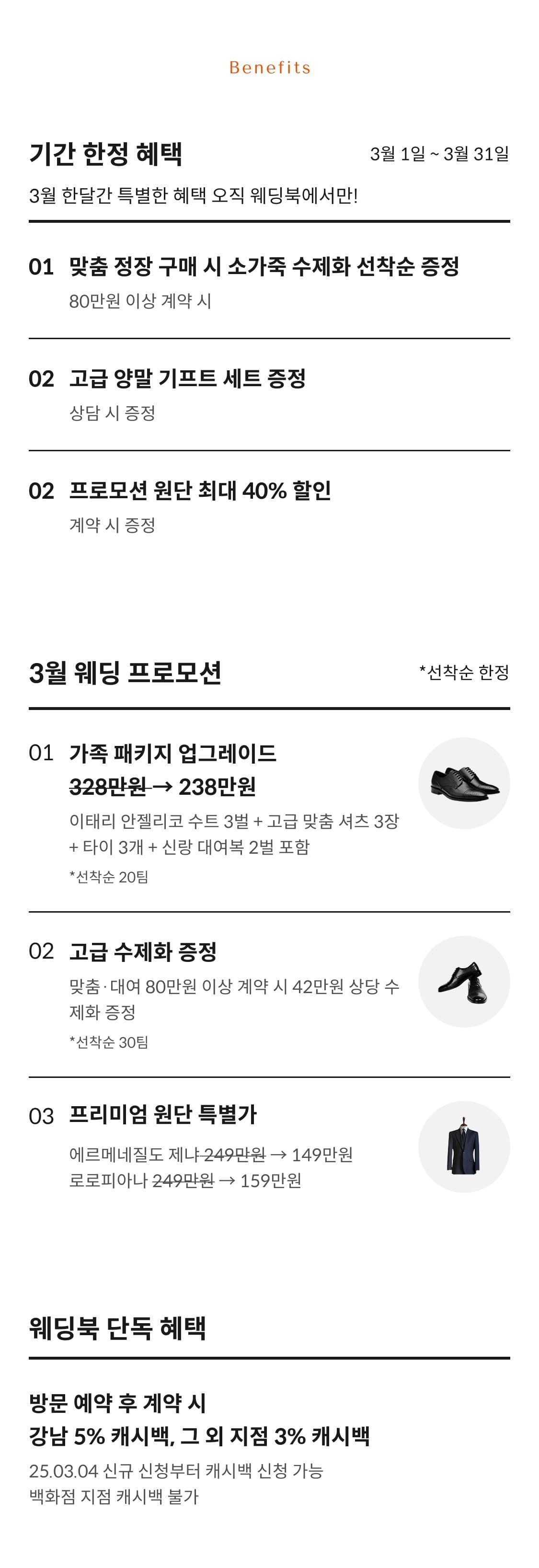 ✔️ 기간 : 3월 1일(일) ~ 3월 31일(화) ✔️ 웨딩북 앱 예약 혜택 💝맞춤 정장 구매 시 소가죽 수제화 선착순 증정(*80만원 이상 계약 시) ✔️ 상담 혜택 - 고급 양말 기프트 세트 증정 ✔️ 계약 혜택 ✨프로모션 원단 최대 40% 할인
