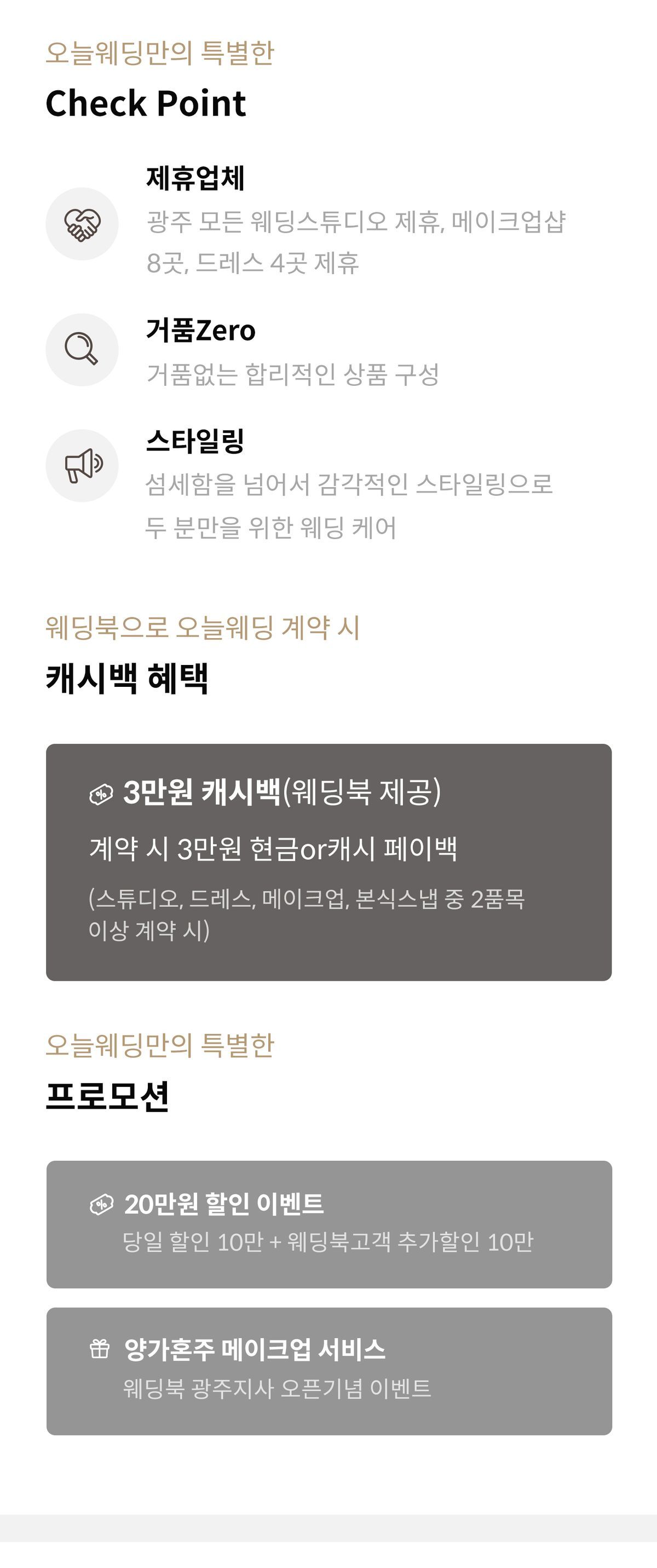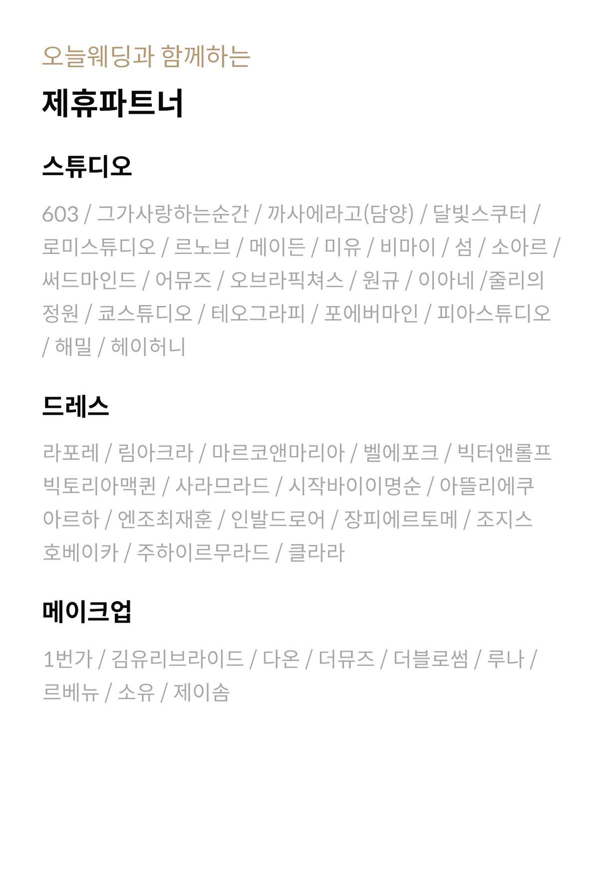 웨딩패키지 품목에는 스튜디오/드레스/메이크업/본식스냅이 해당됩니다. 품목 중 하나만 계약한 경우 혜택은 지급되지 않습니다.
