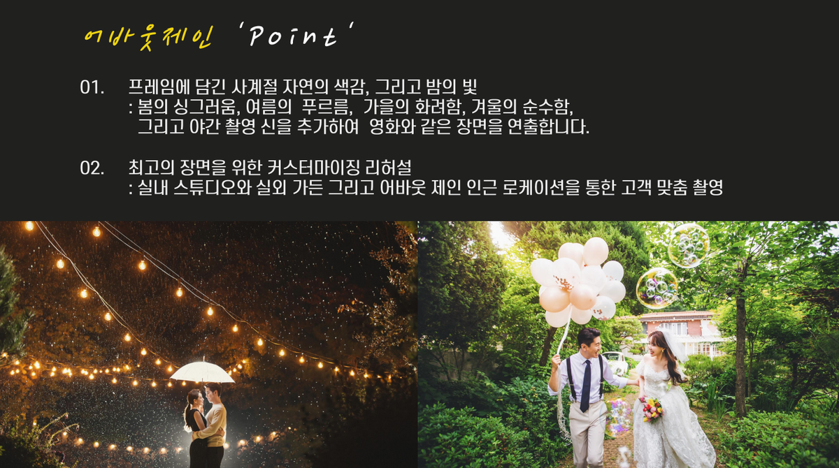 2시간 촬영 (야간씬 불가) 촬영의상 3벌 (개인준비) 10P 앨범 1권 원본+수정본 포함