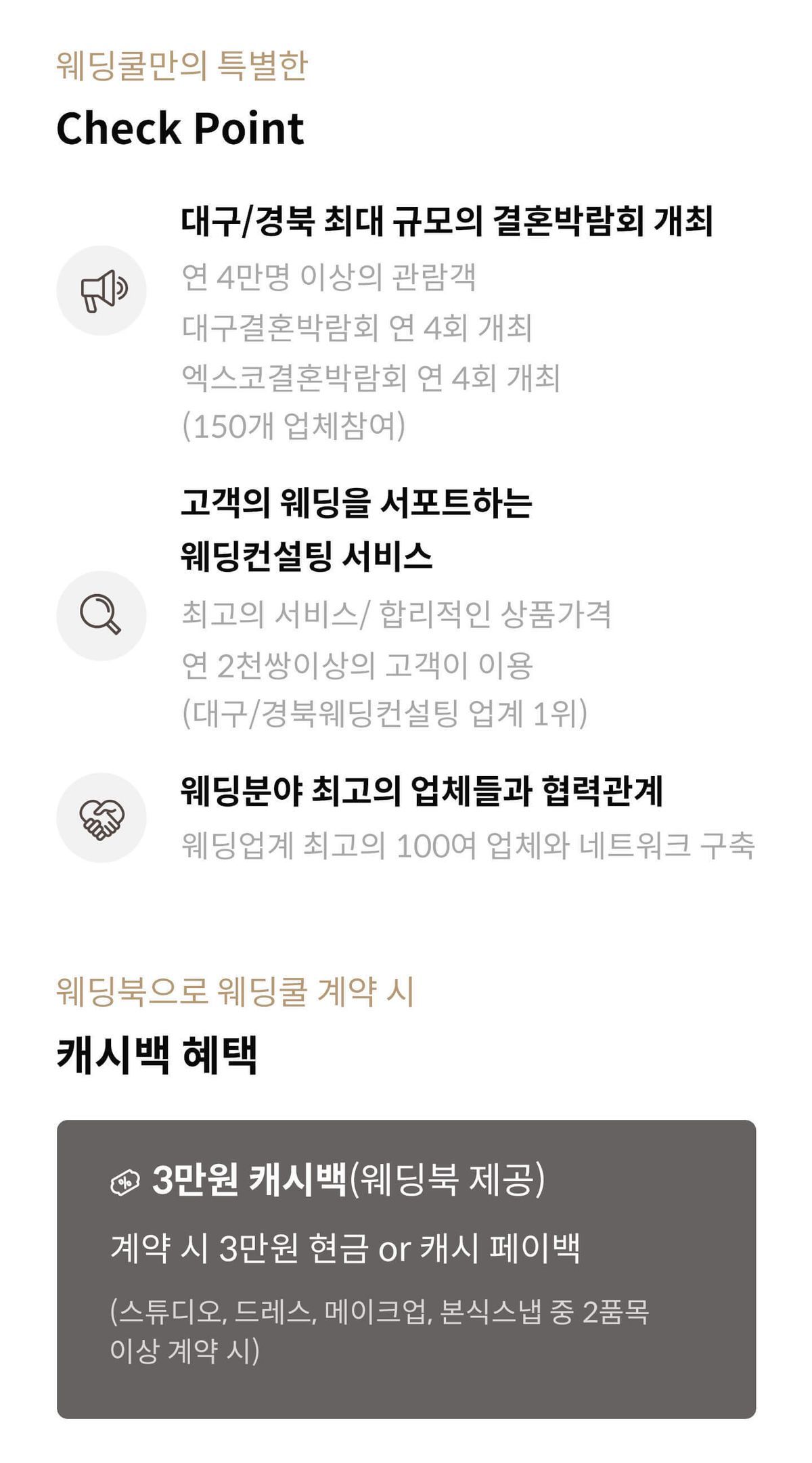 캐시백 혜택은 웨딩북을 통한 최초 상담예약 후 계약 시 지급됩니다.