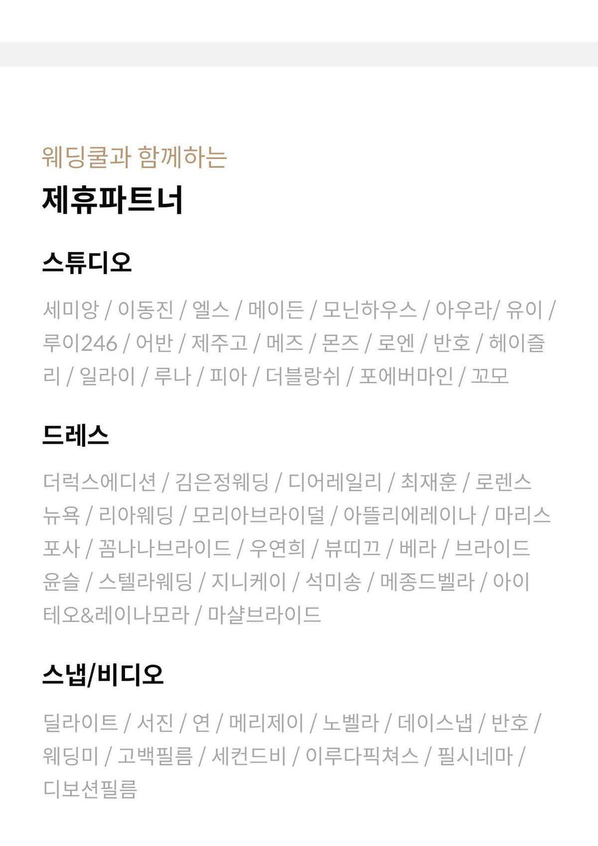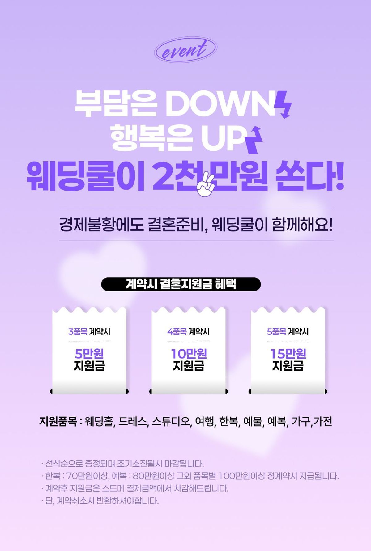 웨딩패키지 품목에는 스튜디오/드레스/메이크업/본식스냅이 해당됩니다. 품목 중 하나만 계약한 경우 혜택은 지급되지 않습니다.