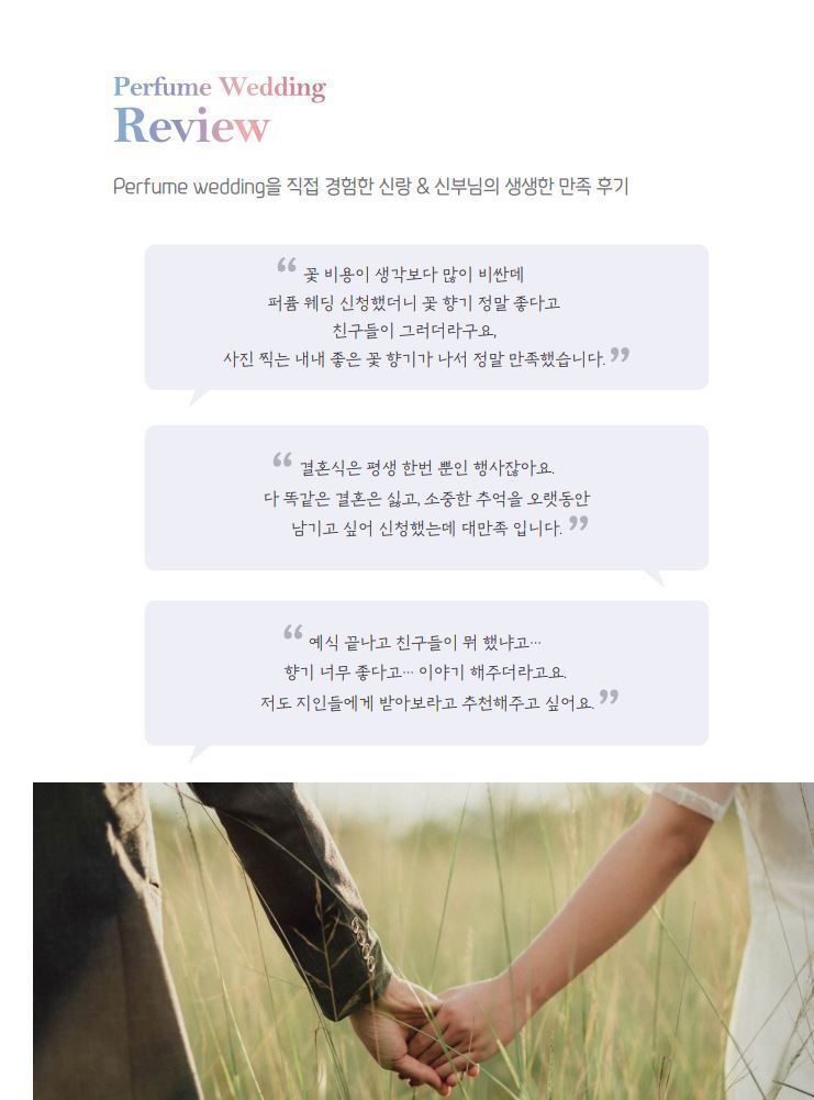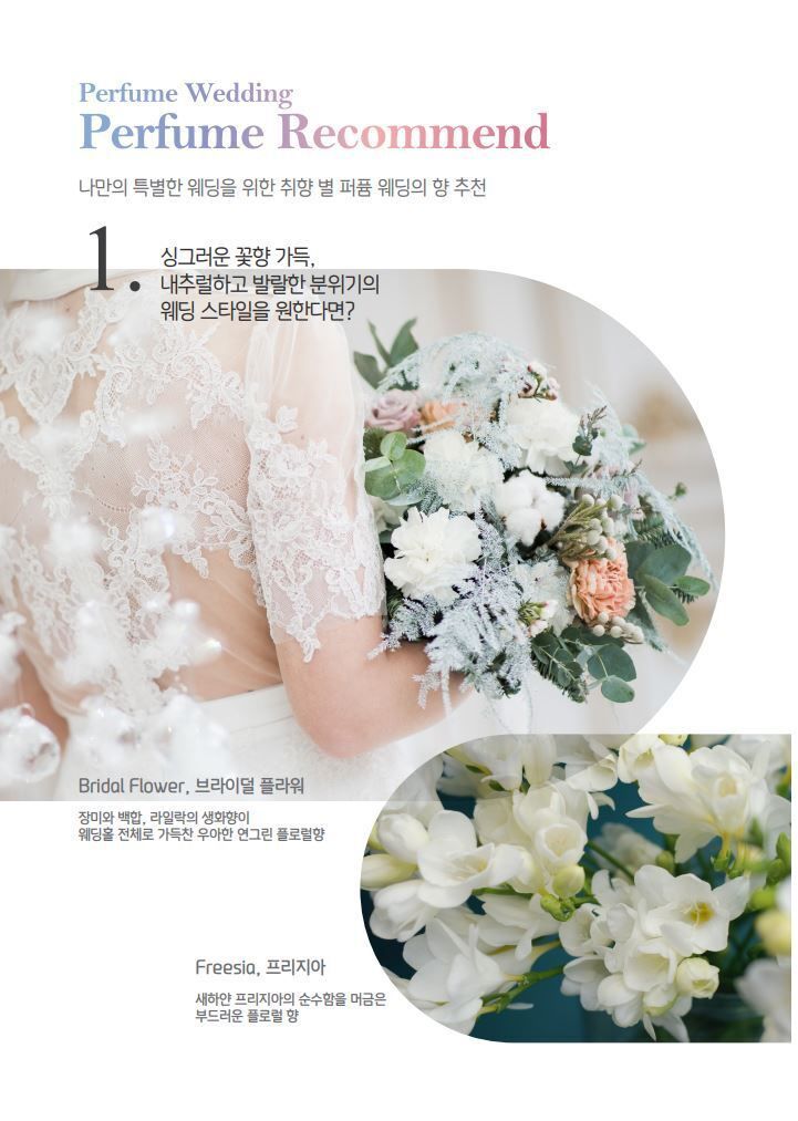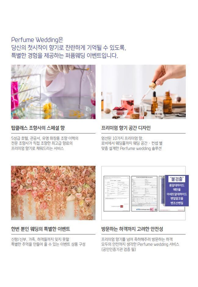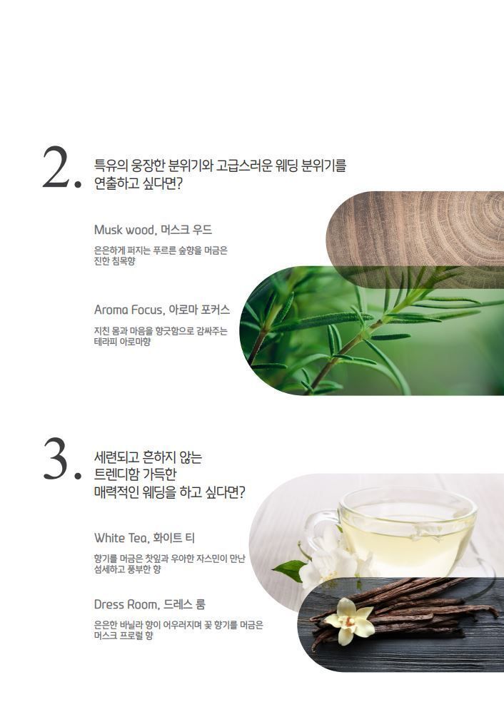 완벽하고 싶은 나의 결혼식을 위해 소중한 하객 분들을 위해 향기를 채워 고급스러운 웨딩을 진행해보세요. 결혼식 방문하면 나는 생화 향을 웨딩홀 전체에서 은은하게 날 수 있도록 발향하는 서비스입니다. 향에 관심 많은 고객님들의 반응이 매우 좋아 적극 추천하는 서비스고, 웨딩북 청담에서 향도 직접 시향해보실 수 있습니다☺ ✔ 10가지 프리미엄향 중 내가 원하는 향으로 ✔ 신부대기실, 홀, 로비, 입구 등 각 위치별로 원하는 향 선택 가능