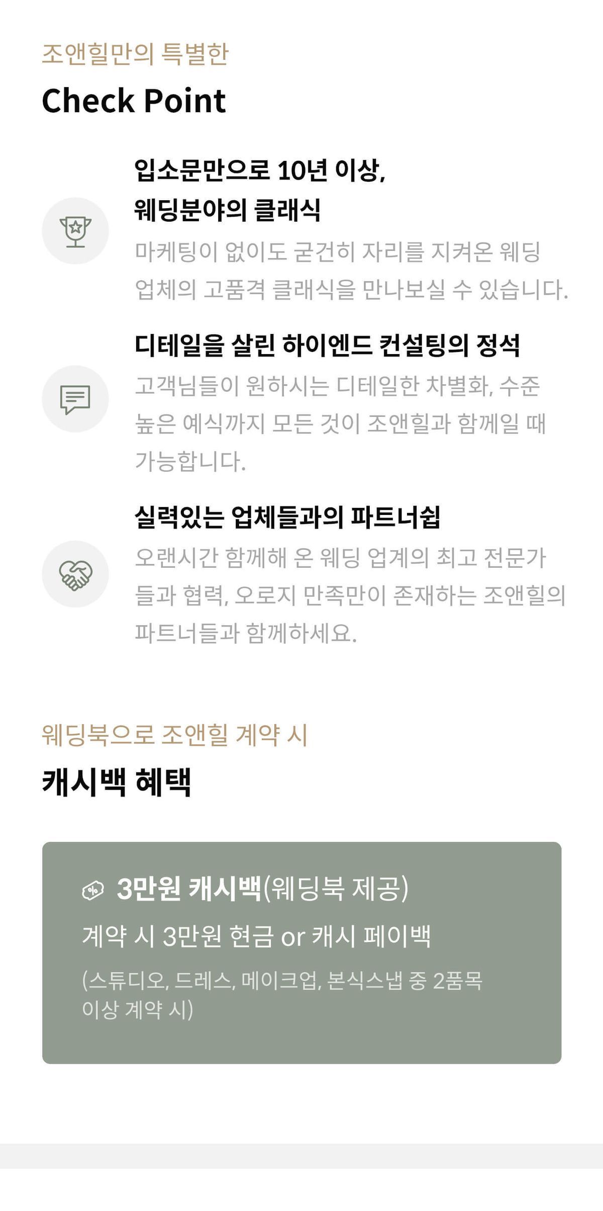 캐시백 혜택은 웨딩북을 통한 최초 상담예약 후 계약 시 지급됩니다.