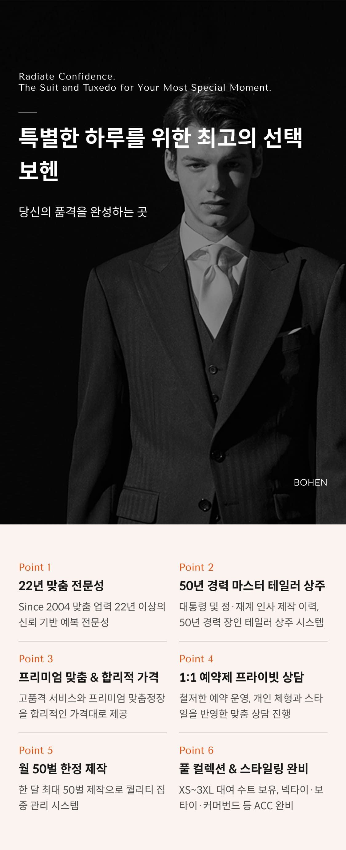✓ Since 2004, 맞춤업력 22년 이상의 믿을 수 있는 예복샵 ✓ 합리적인 가격대에 고품격 서비스와 프리미엄 맞춤정장을 만날 수 있는 곳 ✓ 대통령 및 정·재계 유명 인사들의 맞춤정장을 제작한 50년 경력 마스터테일러 상주 ✓ 철저한 1:1 예약제 & 프라이빗한 맞춤형 상담 진행 ✓ 한 달 최대 50벌 제작으로 최상의 퀄리티 유지 ✓ XS부터 3XL까지, 프리미엄 원단으로 제작된 다양한 대여복 완비 ✓ 넥타이, 보타이, 커머번드 등 스타일링에 필요한 모든 ACC 가능