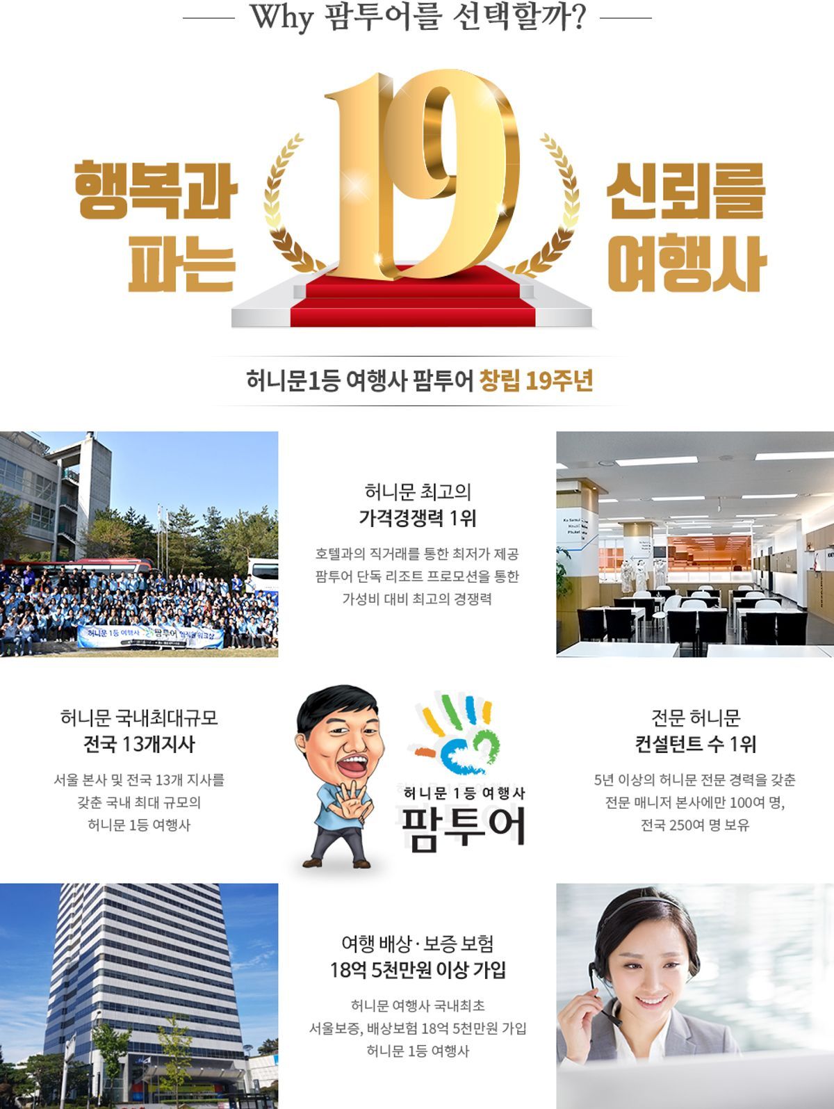 ✓ 강남본사 및 전국 13개 지사를 갖춘 국내 최대 규모 허니문 여행사 ✓ 2013년~2020년 5년 연속 허니문 해외송출 1위 ✓ 팜투어 7년 연속 브랜드 대상 수상 ✓ 허니문 여행사 국내 최초 서울보증, 배상 보험 18억 5천만원 가입 ✓ 현지와의 직거래를 통한 최저가 도전