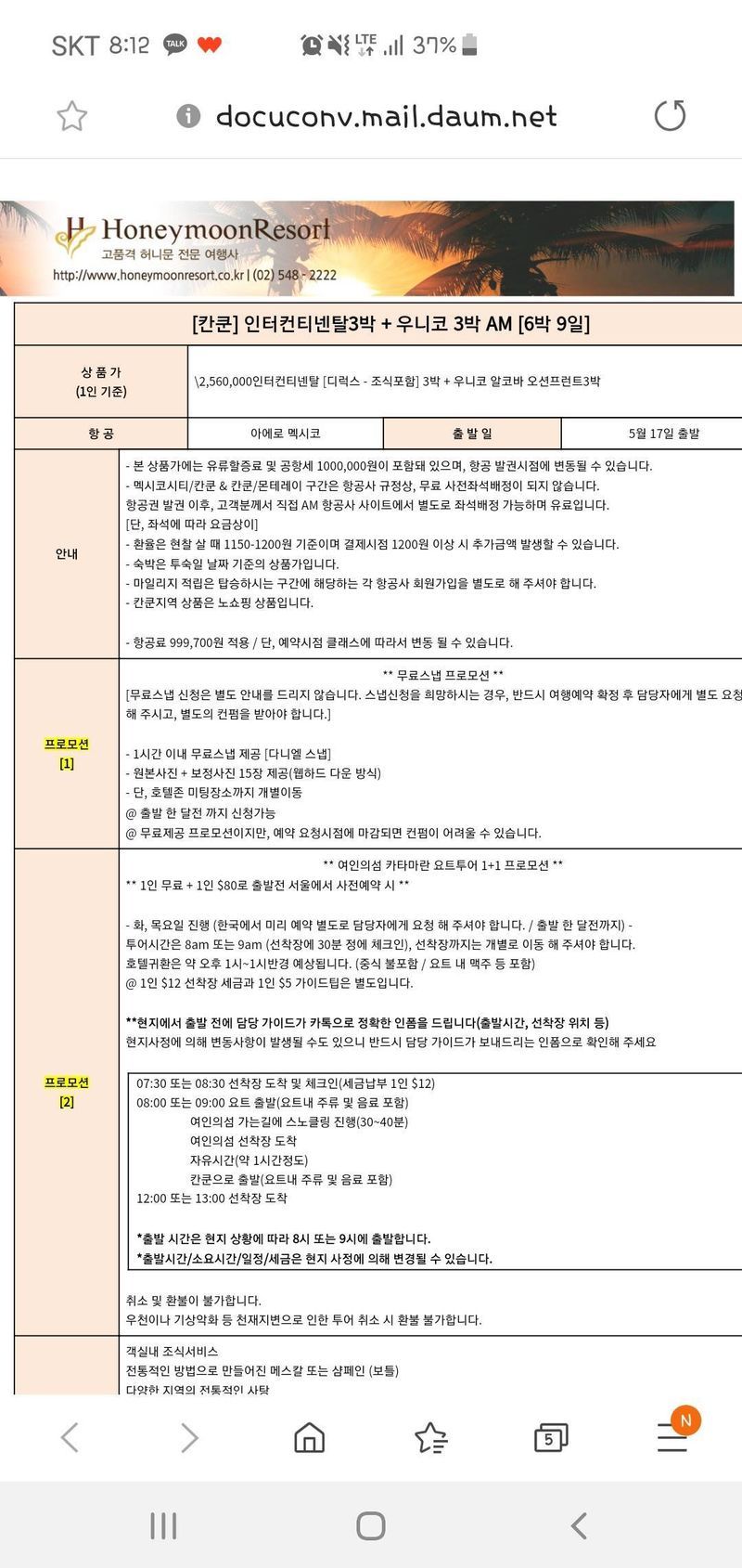 허니문 같은 경우는 스드메나 베뉴처럼 업체랑 고객의 정보의 비대칭성이 심한 품목이 아니라, 알아보면 알아볼수록, 더 본인에게 알맞고 저렴한 구성으로 정할 수 있을것 같아요! 이런거 찾아보는게 너무 귀찮고 힘들고 여력이 없다하시면 전적으로 여행사에 맡겨도 되긴하지만, 다른 예신예랑님들도 좀더 찾아보시고 좋은 선택 하시길 바래요~ 상품 : 추천♥ 칸쿤, 6박9일, 아에로멕시코이용, 인터컨티넨탈3박 우니코3박 포함된 에어텔 상품이요 가격 : 추천♥ 처음에 웨딩앤에서 주관하는 박람회에서 칸쿤 견적을 받고, 이상하게 너무 비싸다 싶어서 찾아보니 업체마다 가격차이가 많이 날수 있다고 들었어요 ㅠㅠ 그래서 인터넷으로 팜x어, x어민, 천x연분닷컴, 한x리여행사, 여x산책 등 들어봤을 만한 거의 모든 신행 업체에 견적 문의드렸엇습니다 ㅎㅎ 가장 빨리 답변 받았고, 가격도 저렴해서 결정하게 되었습니다. 서비스 : 추천♥ 스냅무료, 여인의섬 요트투어 80불에 2인 이용 등의 추가 혜택 받았구요! 무엇보다 사실 가장 좋았던건 여기 담당자님은 본인의 개인적인 의견을 많이 넣어서 여기가시라 저기가시라 안해서 좋았던거 같아요! 저는 어디 숙박할지 거의 확정해서 여쭤본 거였는데, 어떤분은 거기 왜가냐 가성비 생각하면 여기를 가라 이런식으로 말씀하셔서 속상했어요 ㅋㅋ 또 제가 처음에 원했던 리조트가 벌써 자리가 다 찼다고 해서 2순위 리조트로 바꿀일이 있었는데, 관련해서 엄청 빨리 연락주시고 진짜 실시간으로 연락이 되니 그 부분이 마음에 들었습니다!