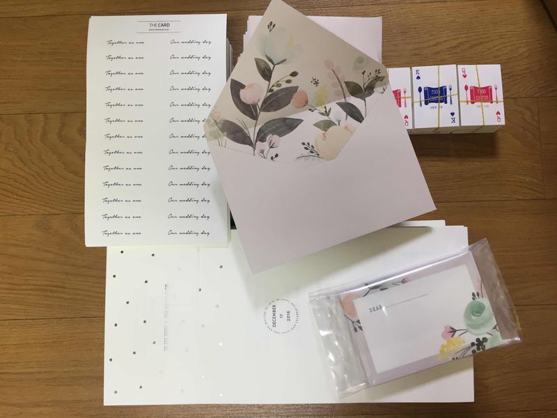 청첩장 돌리는데 사람들이 이런 봉투는 첨이라고 넘 이쁘다고 해서 기분 좋었어요 ㅎㅎ 청첩장도 맘에 들고 영상도 잘만들고 정말 만족!! 입니다 디자인 : 추천♥ 업체마다 디자인이며 스타일 종이재질, 프로모션도 다 달라서 업체별로 샘플 10매씩 거의70매는 봤던거 같아요. 저는 딱 심플 깨끗 이런 이미지로 원하면서도 오히려 봉투나 스티커는 좀 디테일있는걸 원했어서 더카드 디자인이 맘에 들었어요! 스티커도 선택가능하고 봉투디자인도 옵션이아닌 포함이였거든요 가격 : 추천♥ 봉투디자인이 있던터라 아주 저렴한편은 아녔지만 샘플후기나 구매후기등 쿠폰발급을 이용해서 좋은 가격에 원하는 디자인과 질도 좋은 청첩장을 한것같아 만족해요 서비스 : 추천♥ 청첩장 내용을 샘플과 다르게 하고싶어서 이래저래요청했었는데 그대로 다 반영됬구요- 수정도 계속 해줬고, 배송도 엄청 빨랐어요! 금요일 오후에 시안완료했는데 토요일에 왔어요 TIP : 디자인은 샘플보고 취향대로 가격대 맞춰서 고르시겠지만 청첩장 신청시 식전영상이나 모바일청첩장, 웨딩액자등 다양한프로모션이 있더라구요- 거의 모든 업체에 달마다 있는거 같아요- 저흰 식전영상 하고 싶었는데 청첩장 하면서 구매 후기 남겨서 할인 쿠폰도 받고 식전영상까지 무료로 만들었어요-