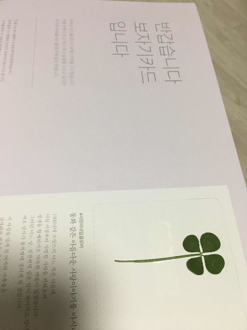 샘플을 받아보았는데 처음에 네잎클로버가 있어서 기분이 좋았습니다! 그리고 박스열자 좋은 향이 나서 보자기카드 업체에 대한 좋은 이미지가 생기게 되네요 ㅎ 디자인 : 추천♥ 저렴이 디자인은 연분홍 펄들어간 카드가 많았어요 광택나는 공주풍 느낌? ㅎㅎ 이런 형태 좋아하는 분들도 계실듯해요. 샘플신청하니 추천디자인 몇개 더 왔는데 추천디자인은 확실히 고급스럽네요 ㅎ 가격 : 추천♥ 저렴이 라인보다 장당 1000원 내외 카드가 이쁜거 같아요 그리고 카드 주문하면 따라오는 부가서비스가 많아서 가성비가 좋으네요 서비스 : 추천♥ 샘플을 몇군데에서 받아보았는데 보자기카드가 제일 패키지 구성이 좋은듯해요 일단 박스에서 은은한 향기 계속 나구요 일괄배송이 아니라 각 고객별로 보자기싸듯이 신경써서 배송해주시는 것 같다는 느낌이 들었어요