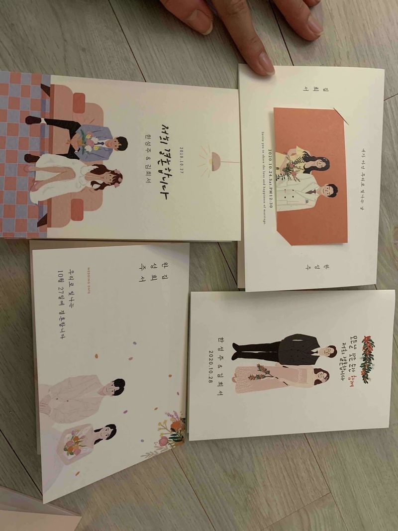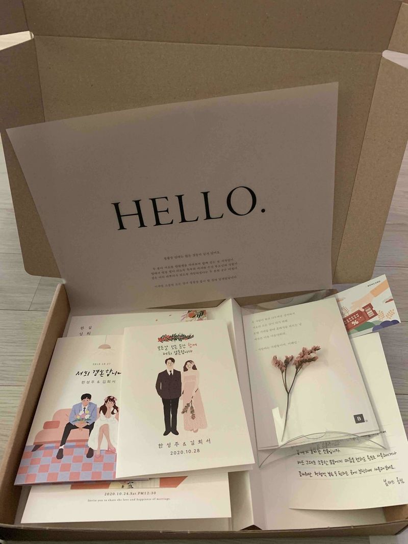정성 스러운 샘플에 감동했어요~~~ 여기서 고르고 싶어요! 청첩장용 향수도 있고 소소하고 꼼꼼하게 잘 챙겨주시는 듯해요! 디자인 : 추천♥ 일러스트 귀여운게 많은데 약간 다 비슷비슷해요! 조금 더 다양한 그림이 있으면 좋을 것 같아요~~ 가격 : 추천♥ 가격은 다른데랑 비슷한거 같구요 종이재질은 두꺼워서 괜찮고 봉투도 고를수 있고 식권도 이쁘더라구요~~ 할인쿠폰같은것도 주셔서 저렴하게 할 수 있을 것 같아요! 서비스 : 추천♥ 일단 박스를 열자마자 제이름이 써있어서 놀랐구요 꽃을 예쁘게 담아주셔서 감동받았어요!! 고객을 위하는 마음이 느껴졌달까 ㅋㅋㅋㅋ 그리고 무료샘플 잘못해서 두번 신청해서 삼천원 결제했는데 전화드리니까 바로 처리해주셔서 좋았어요~~