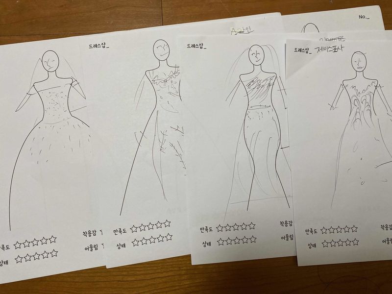 토요일 저녁에 가게 되어서 주말이라 드레스가 많지 않으면 어쩌지 걱정했는데 물론 신상은 아니었겠지만 다양하게 입어 볼 수 있도록 피팅해주셨어요~ 두개의 샵을 선택하고 두번째로 간 샵인데 소재들이 고급스러운 느낌도 들고 예쁘기도 해서 바로 당일 지정했답니다~ 드레스가 다양하기도 하고 모두 예뻐서 촬영가봉도 기대되고 본식가봉도 매우매우 기대된답니다! 다 예뻐서 고르기 진짜 어려울거 같지만요 ㅠㅠ 당일지정 혜택은 본식때 블랙라벨이나 신상드레스를 셀렉하게 되면 추가금 없이 진행한다고 해요~ 모두들 아시다시피 투어때는 실물 드레스 사진을 찍을 수 없었기에 화보집 컷과 예랑이의 스케치 자료로 대체합니다^^ 스타일 : 추천♥ 화려하고, 심플하고, 여성스럽고, 단아한 꽤 다양한 스타일의 드레스를 많이 보유하고 있는 듯 했어요~ 샵 인테리어는 공간이 넓지는 않았지만 심플하게 잘 구성되어 있었어요 옷상태 : 추천♥ 피팅해 보았던 4벌의 드레스 모두 세탁상태도 깔끔하고 비즈 관리도 잘 되어있었답니다 서비스 : 추천♥ 친절하고 따스한 언니같은 느낌을 받았어요~ 예쁘다고 칭찬도 많이 해주시고 즐거운 피팅이었답니다~