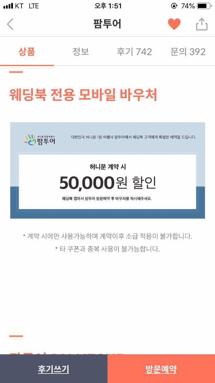 팜투어 웨딩북 고객 전용 5만원권 꼭 챙기세요 :) 박람회 기간에 가면 사은품 줍니다 . 저는 미니가습기+멀티휴대폰충전선+여행다이어리 받았어요. 가계약 걸수 있고, 군더더기 없이 원하는데만 딱 봐주셔서 좋았어요. 팜투어 지인 할인 있으면 중복 할인되고 사은품도 줘서 더 좋아요. 상품 : 보통♥ 유럽여행 패키지를 알아봤어요. 하와이아닌 가격 : 보통♥ 유럽은 대부분 자유여행이고 숙소는 4성급 호텔로 잡아주세요. 서비스 : 보통♥ 딱 필요한 부분만 짚어주시고 필요이상으로 권하지 않고 원하는 루트만 봐주셔서 좋았어요