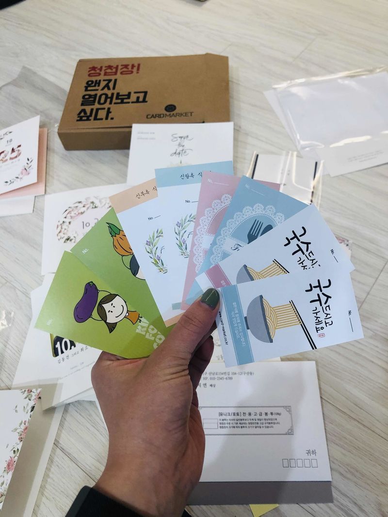 청첩장에 큰 돈 쓰고 싶지 않아서 바른손, 모닝글로리 등등 최저가 기준으로 디자인 비교했는데 카드마켓이 제일 제마음에 드는 디자인이 많았습니다 ㅎㅎ 사실 가격대가 있는 건 어느곳이나 예쁘고, 최저가 기준은 왜 그 가격인지 알 거 같은 청첩장들이 많더라구요! 무료샘플은 인기있는 것과 제가 하려는거 섞어서 10종 받아봤는데요 당일 무료배송으로 다음날 바로 받았습니당 종이 질도 좋고 인쇄상태도 괜찮아요 월요일에 초안 최종 확정해서 수요일날 발송하고 목요일에 청첩장 받아 봤습니다 ^-^ 요즘은 대부분 모바일 청첩장 및 식전영상이 무료인데 종류도 많고 퀄리티도 좋아서 만족해요! 모바일 청첩장의 경우 사진이나 스킨, 문구 등 언제든지 수정 가능해서 편했어요! 주변 친구 결혼하면 추천도 할 거 같아요 ㅎㅎ 디자인 : 추천♥ 청첩장에 큰 돈 쓰고 싶지 않아서 브랜드별로 최저가 디자인을 비교했는데 카드마켓이 제일 무난해서 선택했어요! 샘플은 가격대가 있는것도 받아봤는데 종이 질도 좋고 디자인도 다양해서 좋았어요 ㅎㅎ 가격 : 추천♥ 같은 최저가 기준으로 다른 곳 보다 디자인이 제일 제 마음에 들었어요 ㅎㅎ 사실 비싼건 어딜가나 예쁘니까요 서비스 : 추천♥ 샘플신청 후 쿠폰받을때도 바로바로 발급해주고, 배송문의등 빠르고 친절하게 답변 받았어요 ㅎㅎ 월요일에 초안 결정하고 수요일에 배송시작해서 목요일에 받아봤습니당 !