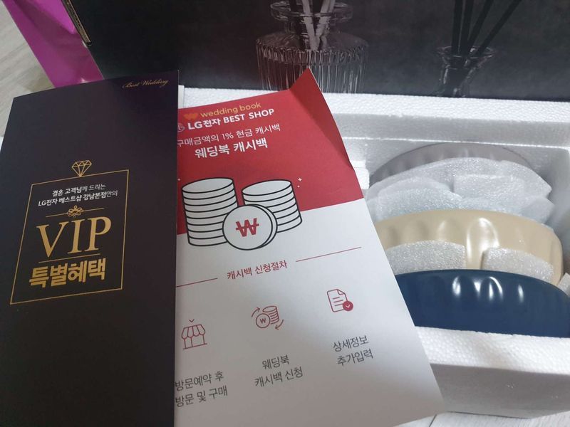 웨딩북 혼수마켓에서 가계약만 하고 왔어요. 9월 입주라서 말씀드렸더니 리뉴얼중이라 지금 견적내면 많이 달라진다고 하셔서 제대로 된 견적은 받지 못했어요. 예랑이가 다른건 몰라도 청소기는 코드제로나인 노래노래를 불러서 ㅋㅋㅋ 어찌됬건 구매할거라 가계약했네요 ㅎ 사은품으로 그릇세트랑 디퓨저도 받아왔어요 상품 : 추천♥ 엘지 코드제로나인 청소기 입소문(?) 흡입력 내구력 가장 좋다고 해서요 가격 : 보통♥ 아직 비교견적은 안받아봤습니다만 웨딩북 제휴로 가장 저렴할거 같아서 가계약 했어요!! 리모델링 중이라고 해서요 ㅠ 서비스 : 추천♥ 웨딩북 혼수마켓한정이라고 캐시백 혜택 있었어요 상담하신 직원분 그냥 솔직한듯한 느낌으로 담백하고 재밌게 상담해주셨어요