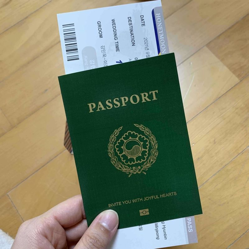 여권 청첩장 디테일 보세요 친구들한테 보여주니 다들 진짜 여권인줄 알았다고 깜짝 놀랐어요ㅎㅎ 다만 어르신들이 여권 청첩장은 좀 어린 취향같다고 하셔서 최종선택은 못했어요 ㅠㅠ 디자인 : 추천♥ 여기서 제 원픽은 여권 청첩장!! 여권이랑 비행기 티켓이 진짜같아서 여행덕후인 제 마음에 쏙 들었어요 가격 : 추천♥ 인쇄상태 크기 품질 다 평균 이상이에요 여권 청첩장 디테일이 대박이에요 ㅎㅎ 서비스 : 추천♥ 특이하고 개성있는 청첩장이 눈에 띄는 곳이에요 ~ 식상한거 싫다 하시는 분들 샘플 받아보세요 ㅎㅎ