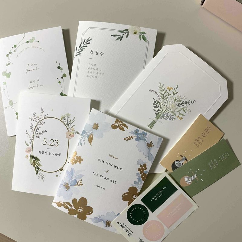 한글로된 청첩장이 갖고 싶었는데 디얼디어에는 있더라고요:-) 예뻐서 일단 샘플을 시켰고 기대만큼 예뻐요. 무료식권도 다른 곳 보다 예뻐서 더 끌립니다 ㅎㅎ 여름 예식이라 샘플이 다 시원초록한데 컬러가 잘 빠졌어요 종이는 얇지않고 도톰합니다~~ 디자인 : 추천♥ 깔끔하고 다양한 디자인이 많아서 좋아요 가격 : 추천♥ 레이저나 금박 같은건 좀 가격대가 비싼편인것같아요 그래도 대량하면 매수에따라 할인되니까 별로 차이는 없는 듯요 서비스 : 추천♥ 박스가 구겨진채로 와서 조금 속상^_ㅠ 그래도 무료로 주는 식권도 봉투도 다 예쁘네요:-)