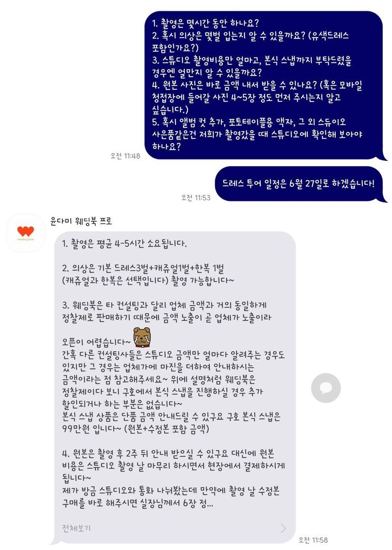 저는 예랑이랑 둘이서 도란도란 웨딩준비를 하고 있어요. 다툴 때도 많지만 웨딩북을 보면서 정보도 많이 얻고 준비도 꼼꼼히 해나가고 있어요. 웨딩상담 : 추천♥ 결혼 준비를 할 때, 알고 있는 정보도 별로 없고 궁금한 것도 많아서 이것 저것 질문을 하였는데 휴일임에도 불구하고 아주 친절하게 답변을 해주셨어요. 스타일링 : 추천♥ 우선 제 취향이 무엇인지 충분히 질문해주시고 답변을 들어주셨어요. 그리고나서 제가 원하는 스타일을 사진과 함께 추천해주셔서 고르기 편했습니다. 분위기 : 추천♥ 직장인 예신이라 통화도 어렵고 방문도 어려운 상황에서 메신저를 이용해서 필요한 만큼 충분히 답변을 해주셔서 아주 편안하고 좋았어요. TIP : 요즈음은 어플에서 후기가 잘되어있으니 사람들의 목소리를 듣고 조사해보시길 바래요! 발품부터 팔면 지칩니다~