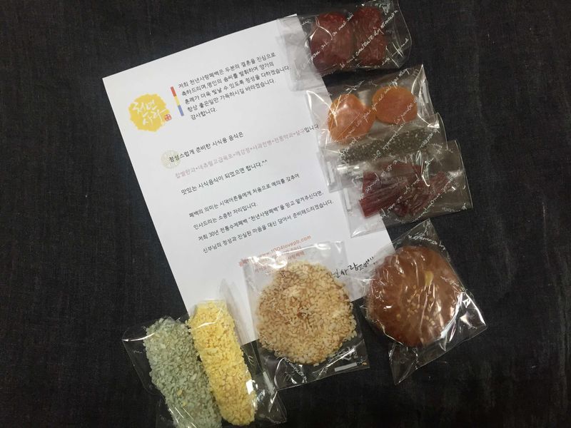 짝궁구해서 함께 하시면 중복으로도 대박 이벤트 가능합니다!!! 구성 : 보통♥ 천년사랑 3호 할생각이에요~~ 시식 신청후 2일만에 우체국 택배로 도착했어요. 가격 : 추천♥ 품질 너무 좋습니다. 시식으로 대추, 육포, 한과 등이 왔는데 약과나 한과는 너무 달지않고 고소했구요. 육포도 질기지않은 신선한 맛이었습니다. 대추알도 컸구요! 서비스 : 추천♥ 여러가지 시식할수 있게 보내주시고, 쪽지까지 정성스럽게 포장해서 보내주셨네요. 너무 만족합니당^^ TIP : 1월예식이 아니어도1월 주문시 해당되는 이벤트가진행중이니 놓치지 마세요!!