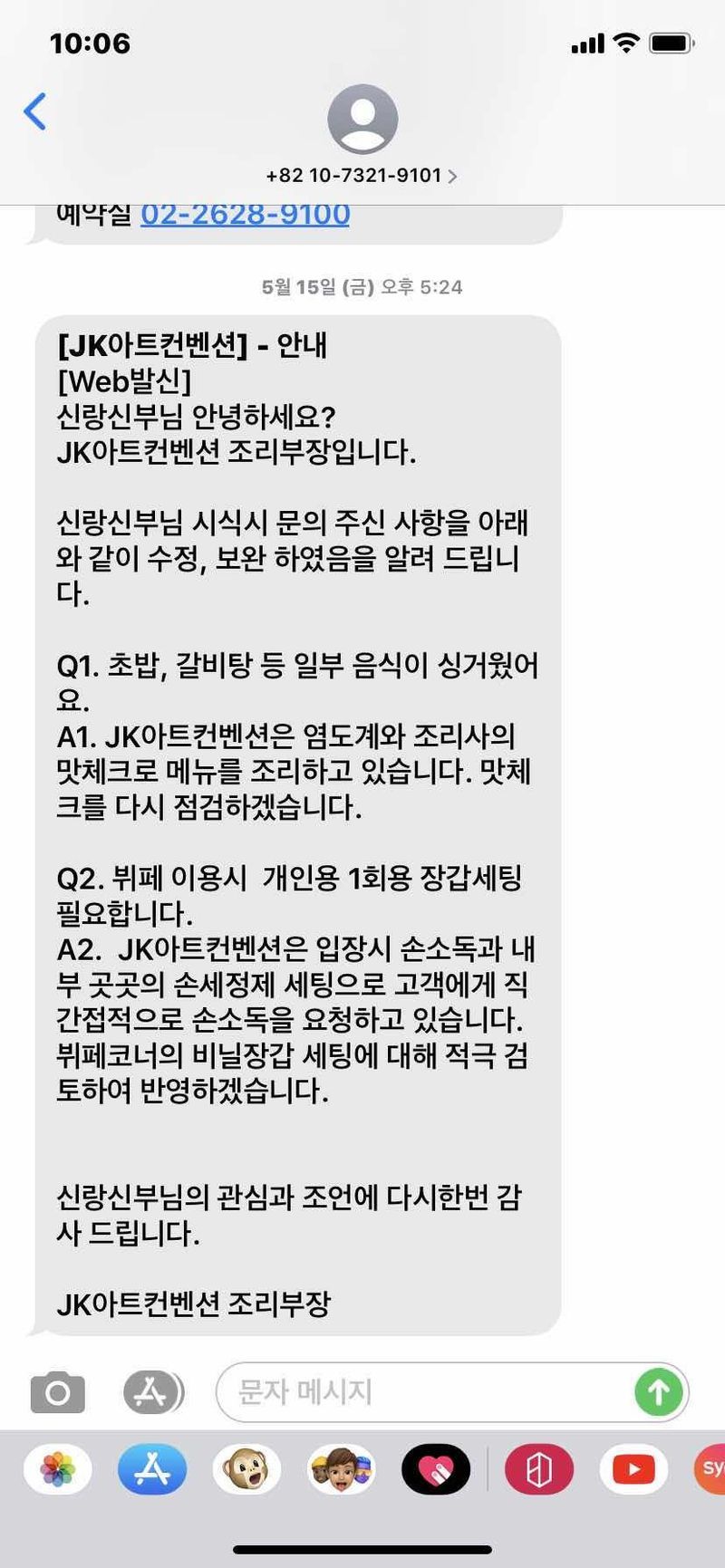 코로나로 인한 걱정! 입장시 발열체크와 손소독 마스크착용을 하지 않을 시 입장 불가입니다. 전 직원 마스크 착용하시고 사진기사분들도 마스크 착용하십니다. 기본이 잘 되어있는 곳 후회 없는 결혼식 스드메를 모두 페키지로 결혼식장에서 했습니다 여러모로 임신으로 인해 알아보는 것은 저에게 힘이들었고 코로나로 인해 식장에서 스드메를 계약했습니다. (꼼꼼하고 예민분들은 알아보시는걸 추천하고) 저는 만족스러웠습니다 신부 신랑 , 하객까지 만족시킨 결혼식장 몇이나 될까요? 식사 식 전에 맛을 볼 수가있어 예약 후 맛보러 갔습니다. 식사를 다 마치면 메인 셰프님께서 모든 신랑 신부의 의견을 듣고 맞춰주세요 다들 하나같이 수북히 접시를 쌓아 올려 너무나 맛있다며 식사하고 가신 하객분들을 보고 제가 다 뿌듯했습니다. 홀분위기, 뷔페 분위기 모두다 깔끔하고 세련됫어요. 직원분들에게 소중한 추억 만들어주셔서 감사합니다. 신부도우미분 잊지못해요. 시크하면서도 친절히 하나하나 챙겨주신 츤데레. 모든 분들이 친절하셔서 저희 시어머니께서도 항상 jk를 왔다가시면 "여긴 늘 친절하시구나~^_^" 하셨어요. 앞으로도 늘 그렇게 승승장구 하시길 빌어요! 찾아가시는 분들에게 고객도 늘 예의를 갖추고 친절히 응대해야 한다는 점 너무나 행복한 결혼식 만들어주셔서 감사합니다❤️👍 홀분위기 : 추천♥ 웨딩홀은 세가지로 나뉘어져 있습니다. 저는 그랜드홀에서 식을 올렸구요 천장이 높아 개방감이 있고 웅장하고 화려한 홀 촌스럽지 않고 예쁜 곳 신부대기실을 보고 너무 예뻐서 꼭 하고싶던 곳^_^ 그래서 저는 여기서 식을 올렸어요! 만족해요! 음식 : 추천♥ 매뉴구성은 너무나 다양해 아마 다 못드실정도에요 거짓 없이 정말로 맛은 제가 다녀본 식장중에 제일 맛있었습니다. 또, 하객분들께서 하나같이 모두 식사 왜이렇게 맛있냐며 밥얘기를 하네요. 결혼식장에서 밥맛있기 쉽지 않은데 여기는 해냅니다. 서비스 : 추천♥ 사실, 제가 임신중에 식을 올렸고 코로나로 인해 심지어 날짜를 미뤘습니다. 그래서 만삭에 임신을 하게 됫고 힘이 너무 많이 들까봐 시어머니께서 신부도우미에게 잘 부탁드린다며 소정의 돈을 드리려 했어요. 절대 안받으시면서 마음만 받겠습니다! 하시며 결국 받지 않으셨고 저에게 끝까지 친절히 대해주셨어요. 뿐만 아니라 모든 직원분들이 한명도 빼놓지 않고 다 친절하기란 쉬운일 아니신데 이걸 또 jk아트컨벤션이 해냅니다. 나석주님께서 저희 담당이셨는데 최고였습니다! 그리고 신부도우미분께도 정말 감사의 인사드리고싶어요. 결혼식준비하면서 코로나 때문에 미루기도 했는데도 기사에 나오는 다른 식장들 처럼 위약금이니 뭐니 기분나쁜 티 하나 안내시고 허허~ 하시면서 천천히 이야기 해주시며 안내해주셨어요! 고객 입장으로써 저희도 친절히 대했답니다! (고객도 예를 갖춰야하는건 백번 옳아요)