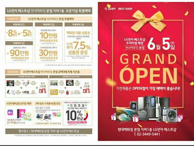 오픈매장이 제일 싸다는 말에 방문했습니다. 다만 오픈빨이 끝났는지(?) 저희가 다른 매장에서 견적받은것과 큰차이가 없어서 계약은 하지 않았습니다. 직원분들은 친절하시고 좋았지만 매장이 백화점내에 있다보니 아무래도 협소해서 물건을 실제 만져보거나 구경할순없었어요. 방문계획이시라면 다른 매장에서 미리 견적뽑으실때에 한번씩 보고 가는걸 추천합니다~(매장안에 제품이 많지않습니다) 상품 : 보통♥ TV/워시타워/에어컨/냉장고 견적받았습니다~ 가격 : 오픈매장이라고 많이 할인가능할거란 얘기 듣고갔는데, 예상만큼은 아니였어요. 오히려 다른 엘지 매장보다 비싼항목도 있었습니다. 아마 오픈한지 꽤 되고 백화점이라 그런게 아닐까 생각해봤네요 서비스 : 보통♥ 담당해주신분이 친절히 안내해주셨어요 하지만 매장이 좀 가전매장치고 작고 사람이 많아서 제대로 물건을 만져보거나 할순없었고 인터넷으로 모델보여주시고 했네요~