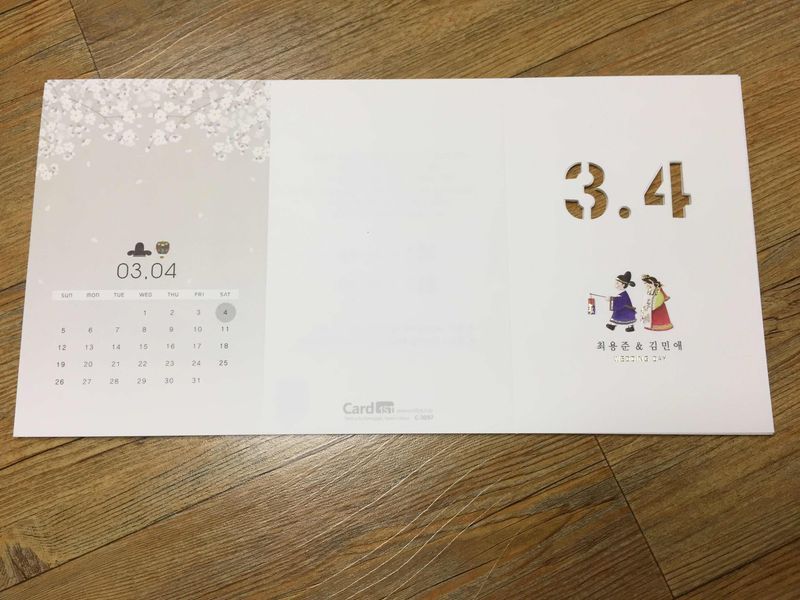 정말 강추합니다^^ 디자인 : 추천♥ 한복 입은 신랑신부가 있어 전통적인 느낌도 있고 캐릭터가 일단 너무너무 귀여워요ㅎㅎ 신랑이 청사초롱 들고 있는 것도 귀엽고ㅎ 신부도 연지곤지 찍고 부끄부끄 뒤따라 가는 것도 귀엽고ㅎ 맨 앞에 예식 날짜가 턱 하니 크~~~게 각인되어 있는 것도 넘넘 맘에 들어요! 각인 비용이 따로 추가되긴 하지만..ㅠㅠ 저거 한장 펼치면 달력이 있고, 예식 날짜에 표시가 되어 있어요~ 한장 더 열면 천첩장 문구와 위치 교통편 등등 있구요~! 넘넘 맘에 들어용^^ 가격 : 추천♥ 가격대비 품질 좋아요~ 양가 합쳐서 500장 인쇄했는데 20만원 초반대 나왔어요! 일단 타카페 제휴되서 10프로할인 기본으로 들어가고 카드일번가 자체적으로 하는 후기 작성 행사 참여해서 2마넌 할인 받았어요^^ 서비스 : 추천♥ 초안 작성할 때 세번인가 수정했는데 신속하게 잘해주셨어요~ 시간이 좀 걸릴경우 양해문자도 해주셨고 친절했습니다^^ TIP : 전 솔직히 우리가 맘에 드는 것 보다는 부모님 마음에 드는 걸로 골라야한다고 생각하고 선택했어요~ 저희보다는 부모님 손님이 훨씬 많기도 하구요.. 요즘 저희는 모바일청첩장으로 많이 보내지만 어른들은 종이 청첩장 보내시거든요 물론 받아보시는 분들도 부모님 지인분들이 더 많으니까뇨~ 꼭 우리 맘에 드는 디자인 말고 부모님 맘에 드는 디자인으로 골라보시는 걸 추천합니당^^ 천첩장 나온거 보시고 부모님도 무척 좋아하세요~~