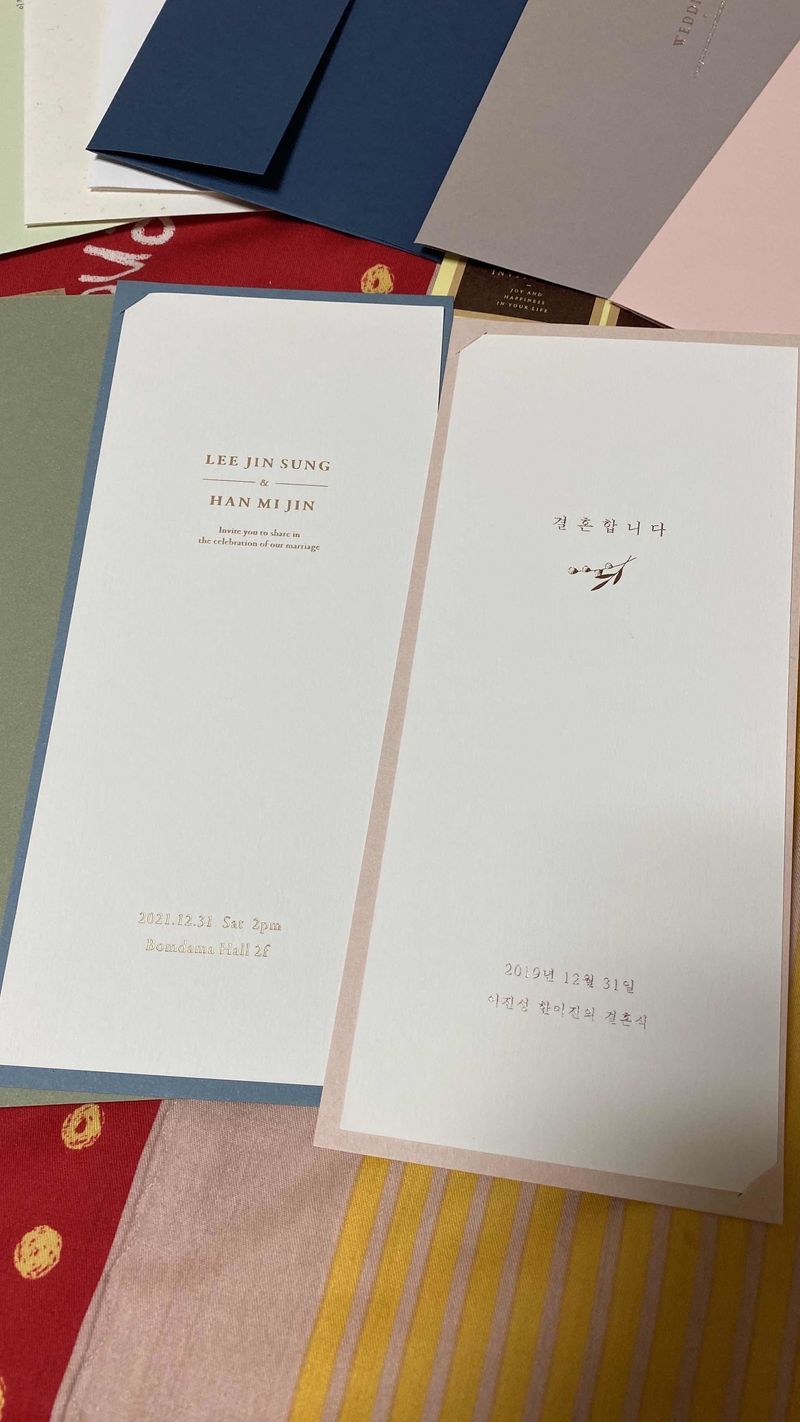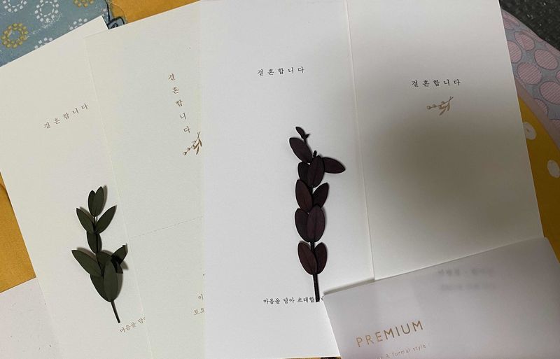 청접장을 찾다가 심플하면서... 색다르고... 예쁘고... 고급지고.. 이거저거 다 고려한 끝에 찾은 업체였어요! 직접 만져보면 색깔이 더 고급져요~ 종이 재질도 두껍고 좋아요~~^^ 강추합니다~ 디자인 : 추천♥ 디자인이 정말 고급스러워요~ 저와 예비신랑은 한장짜리 청접장을 찾고 있었는데 딱인거 같아요~^^ 종이 재질도 두꺼운것 보통인것을 고를수 있어서 좋고 너무 밋밋하다 싶으면 끈이나 미니카드, 꽃으로 포인트을 줄수 있어요~ 특히 봉투 색깔이 너무 고급져서 50장씩 색깔별로 주문해서 사용하고 싶은 마음이 들어요 ㅠㅠ 예산이 많이 들겠지만요~ 나만의 심플하면서도 고급진 청접장을 원하신다면 추천해요! 가격 : 추천♥ 일단 샘플만 받아본 상태입니다. 가격은 견적눌러봤는데~ 제가 원하는 청접장은 300장에 40-50만원 사이더라구요. 가격은 좀 있는 편이지만 고급진것을 본 제 눈이.. 더이상 타협을 하지 않을듯해요 모바일 청접장 무료랑,, 식권200장 무료,, 등등 이벤트 받는거 생각하면 그래도 나름 괜찮은 가격이라고 생각합니다. 서비스 : 추천♥ 샘플 택배로 받았습니다. 3일정도 걸렸고 포장도 잘되어있었어요^^