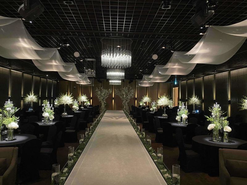어두운홀에 예쁜 생화장식에 생긴지 얼마안되서 깨끗한 느낌이었습니다. 다만 연회장이용시 엘리베이터를 이용해야하고 타이어뱅크 건물에 가려져서 외관으로 봤을때 웨딩홀 느낌이 안나는게 아쉬웠어요. 홀분위기 : 어두운홀에 250명정도 하객으로 치루기 적당한 사이즈에요~ 1층이 층고가 더 높아서 마음에 들었어요 음식 : 보통♥ 당일에 음식은 세팅되어 있지 않아서 연회장만 둘러보았습니다 서비스 : 보통♥ 투어해주실때는 친철했는데 코로나 2단계 격상하고 계약금 환불받으려고 연락했더니 전화연결도 안되고 불친절하게 응대해주셔서 별로였네요..