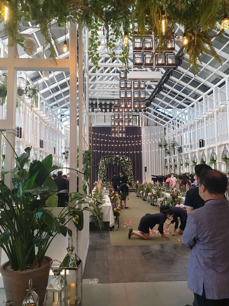 신부대기실에서 바로 입장이 안된다는점,, 짐을 보관할 곳이 없어 들고다녀야 하는점이 아쉬웠지만 홀이 야외예식처럼 밝고, 날이 안좋을 땐 노란 불빛으로 또 다른 느낌을 줄 수 있어 좋은 것 같아요. 아그리고 폐백실이 크고 멋있어요 홀분위기 : 추천♥ 화사한 분위기로, 성수기에는 생화 비수기는 버진로드는 조화 그 외는 생화입니다~ 신부대기실에서 바로 홀 입장이 아니라 아쉬워요 음식 : 보통♥ 음식은 코로나로 아직 못먹었는데, 내년 날짜 기준으로 2단계 지속시 1인 상차림도 생각하고 있다고 하셔요 서비스 : 보통♥ 처음 전화상이나 안내받을 때 막 친절하다 느낌은 아니었지만 물품을 보관할 곳이 없어 요청해보니 귀중품 제외 옷 같은 부분은 따로 자리를 마련해보겠다고 해주셨네요