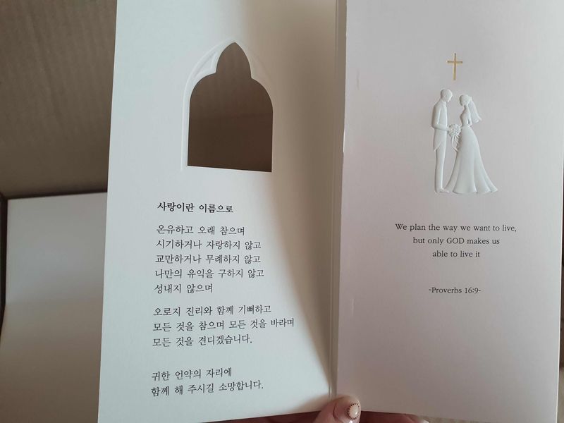 그저께 입금한것같은데 오늘 도착했어요!! 토요일인데요!! 엄청 빨리 제작&배송 해주셨구 수정사항 있어서 2번정도 요청했는데 요청대로 빨리 처리해주셔서 만족스러웠습니다~~ 디자인도 너무 맘에 들어요 ❤️ 디자인 : 추천♥ 디자인은 이거 하나 보고 골랐어요.. 예배식 예식 진행하려고 하는데 너무 찰떡인 청첩장 발견..!!! ❤️ 가격 : 보통♥ 종이 끝부분 마감이 조금 아쉽긴 한데 문제는 없습니다~ 서비스 : 추천♥ 결홈을 축하한다는 센스있는 카드와 “엄청나게” 빠른 제작 및 배송.. 감동입니다 :-)