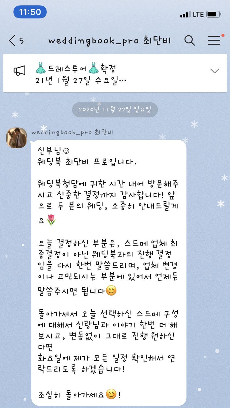 11월말쯤 남자친구와 함께 웨딩북에 방문했습니다! 제휴업체들과 서비스 모두 너무 잘 되어있어서 굳이 박람회를 가지 않아도 충분하다는 생각이 들더라구요! 그 중 단비 프로님과 상담은 잊지 못합니다ㅠ 제가 원하는것이 뭔지 잘 알아주는 플래너님은 단비프로님뿐이었거든요ㅠ 말이 너무 잘 통해서 정말 즐거웠던 상담이었고 시간가는줄도 몰랐었어요! 그리고 상담 후 카톡으로도 언제든지 원하는 답변을 빠르게 주시고 고민되는 부분에 있어서는 성심성의껏 답변을 주셔서 같이 결혼을 준비하는 모든 시간들이 넘 행복합니다!❤️ 웨딩상담 : 추천♥ 결혼준비하는 a부터 z까지 상세하게 알려주시고 또 물어도 상세하고 친절하게 알려주셔서 결혼준비하는 내내 너무 행복한 요즘입니다!❤️ 단비 프로님이 저한테 맞는 스드메 업체도 잘 추천해주시고 제가 가성비를 중요하게 생각하는걸 알고 저한테 찰떡인 가성비 업체를 우수수 추천해주셔서 저는 보고 고르는거 말고 한게 없네요!!❤️ 결혼준비하면 예민해진다는데 단비프로님이랑 함께여서 너무 행복하고 감사할뿐입니다!! 제 주변에도 적극 추천할거예요! 믿고 함께하는 단비 프로님 항상 감사합니다❣️ 스타일링 : 추천♥ 스튜디오는 야외촬영과 실내 촬영이 골고루 있고 색감이 좋은 곳으로 추천해주셔서 마음에 딱 맞는 업체로 선정했습니다! 드레스샵은 제 얼굴과 피부색에 맞는 스타일의 업체로 골라주셨고 투어할 업체를 정해놔서 전혀 걱정이 없어요❤️ 메이크업은 제 평소 메이크업을 보시고 콕집어 추천해주셨는데 추천해주신 업체 모두 인스타로 봤더니 정말 너무 맘에 들더라구요!! 단비 프로님이 추천해주신 업체로 다 했어요❤️ 분위기 : 추천♥ 우리 단비 프로님은 일단 신부와 신랑의 분위기에 맞춰서 모든 업체를 선정해주십니다! 어플에 여러 업체가 많아서 고르기가 힘들었는데 제가 했던 사소한 얘기들 다 기억해두었다가 하나씩 추천해주셨어요! 덕분에 제가 준비하는데 수고로움이 덜하고 딱 마음에 드는 업체들을 선정할 수 있었어요❤️ 일하면서 준비하는거 많이 번거로웠는데 단비프로님이 정말 친절하면서도 때론 불필요한것엔 단호하게 말씀주셔서 더욱 믿을 수 있었어요! 다른 업체 플래너분들도 많이 만났었는데 그동안 정보만 주고 날 위한 정보가 아니라고 생각했었거든요! 그런데 단비프로님은 정말 제가 원하는 내용을 잘 캐치하고 정말 저희만을 위한 결혼 플랜을 짜주셔서 너무 좋았습니다❤️ 남은 기간도 잘 부탁드려요!! TIP : 처음 결혼준비할때 사치덩어리였던 저를 단비프로님이 가성비 있게 업체 선정하는 법을 잘 알려주셨어요! 단순 정보만 나열하는 플래너 말고 정말 자신만을 위해 정보를 주고 함께 결혼을 준비해주실 수 있는 그런 프로님 만나는게 결혼 준비의 반은 되는거같아요! 저희 단비프로님 정말 적극 추천합니다❤️