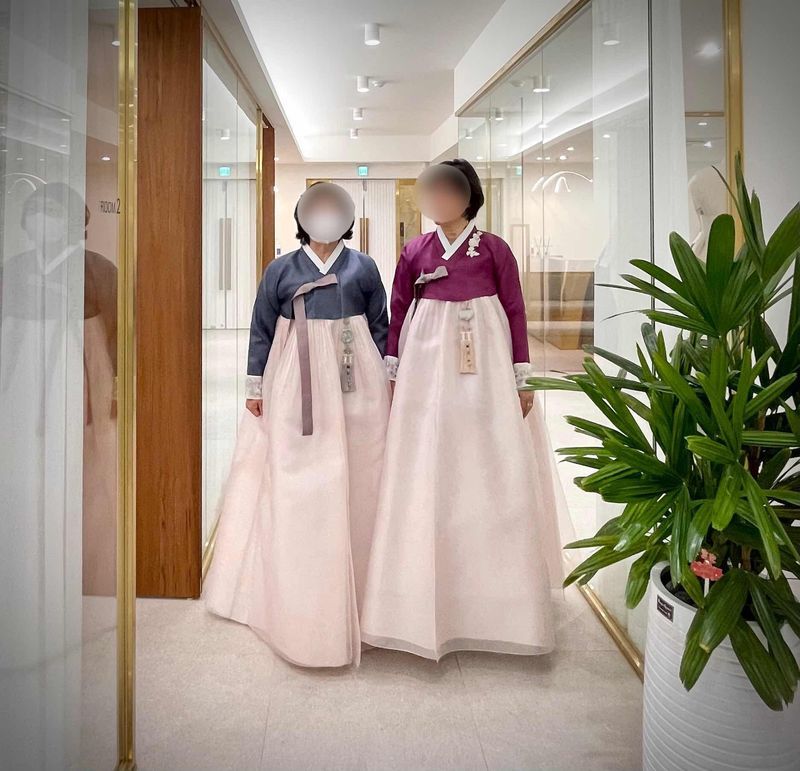 흰 눈이 펑펑 내리던 그 다음 날 오늘 한복 투어 일정 중 첫 번째 샵이 바로 휘랑한복이었어요. 엄마와 예비시어머니 그리고 저와 남자친구가 함께 보러간 자리라 어색어색.. 했는데 휘랑한복 계약을 마치고 나온뒤로는 더 화기애애 해져서 돌아오는 차안에서도 두분이 이런저런 얘기나누시는게 참 보기좋았습니다 :) 그만큼 두 분의 만족도가 높았고 예약했던 뒤의 다른 샵들을 가지 않아도 되어 시간절약이 됐어요. 한복샵 예약 예정인분들 이곳을 1순위로 먼저 예약해서 꼭 보시면 좋겠어요! 저희 어머님 두 분다 첫째아들이 결혼할 때 맞춤한복으로 제작하셨기에 원단, 퀄리티, 샵 느낌 등.. 이미 알고 계셔서 더 확고하게 여기로 선택하셨다고 합니다. 사실 두 분이 함께 만족하는 디자인을 찾기도 쉽지 않은데 정말 다행이었어요! 두 분다 선호하는 색도 찰떡 같이 찾으시고♥️ 저는 원래 파스텔톤을 생각했는데 막상 또 입어보시니 다르더라구요. 나이와 분위기에 어울리는 색상이 따로 있는거같아요. 샵 분위기야 이미 다른 후기 사진들로 아실테고.. (확실히 샵이 크고 좋으니 부모님들 만족도도 높아질 수 밖에 없어요), 대표님(원장님?)의 전문적인 상담과 추천, 무엇보다도 그냥 본견이 아닌 명주원단으로 디자인이 들어간 한복이 너무 예쁘더라구요. 그냥 보면 알아요. 프리미엄 라인이었지만 가격도 합리적으로 저희를 배려해주셔서 잘 얘기해주셨기에 더 망설임없이 이곳을 선택했습니다 ㅎㅎ