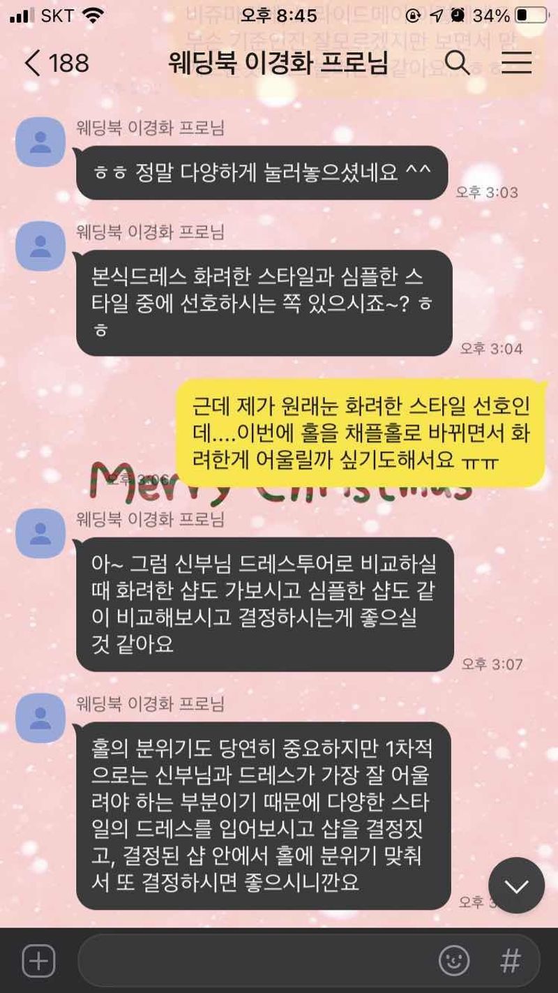 꼼곰하게 예약도 해주시고 항상 궁금한점 물어봐도 친절하게 대답해주셔서 좋았어요. 근데 어제 프로님이 그만둔다는 소식듣고 많이 아쉬웠어요 ㅠ ㅇ프로님들이 개인사정으로 인해서 그만두시는건 어쩔 수없지만 컨시어지님이 바로 알려주시고 다음 분으로 인계해주시는게 필요할것같아요 ㅠㅠ 웨딩상담 : 추천♥ 웨딩북 통해 홀 예약하고 스드메가 너무 고민되어 방문했었어요. 모르는 부분을 많이 질문했는데 친절하게 상담해주셨어요. 스타일링 : 추천♥ 몇가지 취향에 대해서 물어보셨었는데 업체 구성 잘해주셔서 프로님이 추천해주신 메이크샵과 드투후 드레스샵으로 정했어요! 분위기 : 추천♥ 우선 제 의견부터 먼저 물어보시고 친절하고 편안한 분위기에서 상담할 수 있어서 좋았어요!!