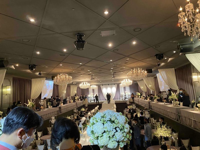 제일 기대 안하고 간 홀이지만 너무 예뻤던 홀 ㅠㅠ 돈과 본가들과의 거리때문에 계약안했지만 약간 아쉽네용 홀분위기 : 보통♥ 밑에 층의 어두운 홀 아니고, 윗 층에 있는 밝은 홀을 볼려고 갔었어요. 사진보다 실제로 보는게 너무 예쁘더라구요ㅠ 좌석도 넉넉히 있었는데 뒤에서 하객들이 서있는 공간이 너무 적어서 다들 낑겨서 보시더라구요 그게 아쉬웠어요! 음식 : 보통♥ 한상 차림이었어요! 안먹어봤지만 약간 다 양이 적어보여서 ,, 하객분들이 만족하고 가실 수 있을진 모르겠는,, 한상차림이었네요,, 서비스 : 보통♥ 직원분은 친절하셨는데 가격이 너무 쎄서 못했어요,, 1800? 정도로 견적 받았었습니다ㅠㅠ