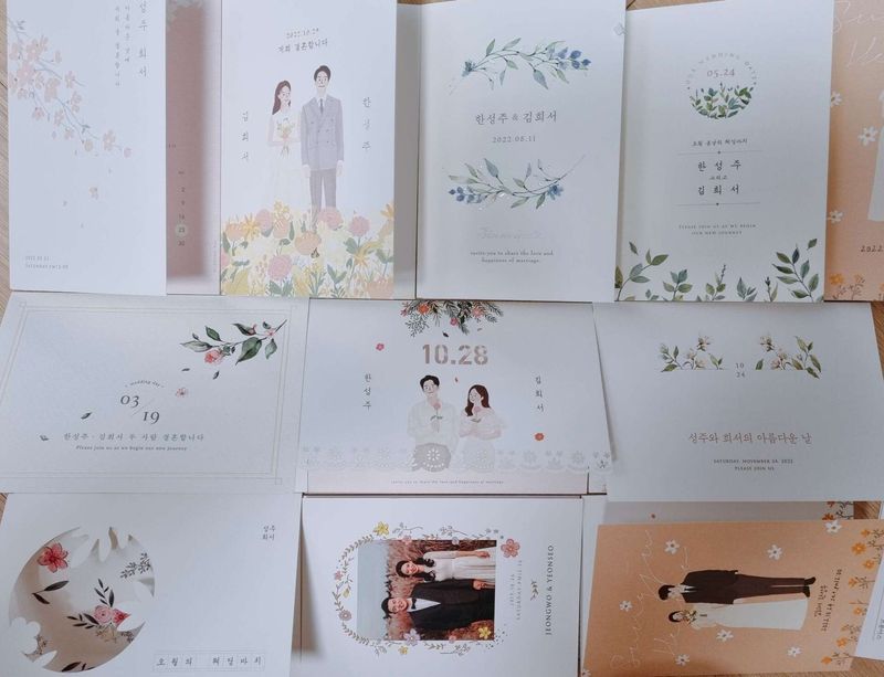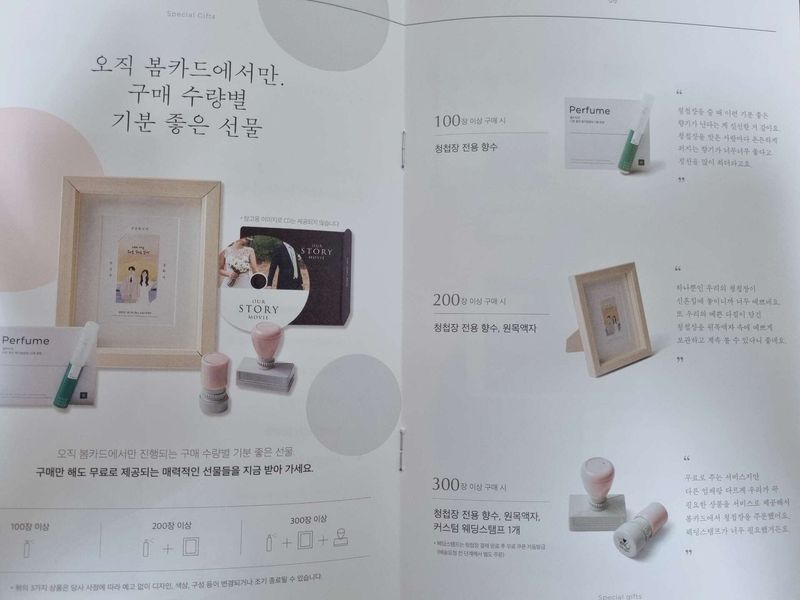 청첩장 샘플 여러 업체에서 받았는데 3군데에서 1~2장씩 예쁜게 있었고 그중에서 혜택 비교하고 봄카드로 선택했어요~ 청첩장 제일 앞에 이름과 날짜가 잘보이게 디자인되어 있어서 좋은거같아요^^ 디자인 : 추천♥ 봄카드 청첩장은 대체적으로 깔끔한 느낌이었어요. 달력이 기본으로 거의 있었고 웨딩홀 약도가 컬러로 인쇄되어 더 예뻐요~ 가격 : 추천♥ 청첩장 업체별로 샘플 신청했는데 그중에서 예쁜거 한두개 골라서 혜택을 비교해봤는데 봄카드가 좋아서 봄카드로 선택했어요~ 봉투도 핑크나 민트처럼 유색봉투 기본으로 선택가능해서 좋아요 서비스 : 추천♥ 주문수량별로 사은품 혜택이 다른데 액자가 예쁘더라구요~ 모바일 청첩장도 2개로 기본 제작 가능해서 더 좋았어요!