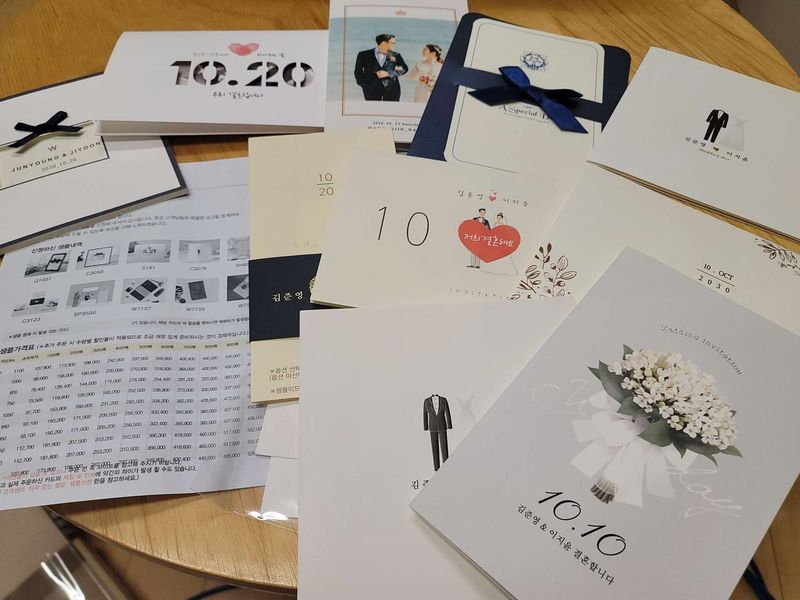 가격표 같이 온 점 아주 좋았어요. 제가 최종 탑3를 추리고 남자친구가 젤 왼쪽 디자인을 골랐는데.. 저희 사진이 들어가는 건 줄 알았는데 다시 확인하니 그냥 고정 이미지 였어요 ㅠ 저희 1탑이었다가.. 아웃... 가격도 맘에 들고 다자인도 맘에 들고 안에 사진만 바꿀 수 있으면 바로 선택이었을 텐데 아쉬워요. ㅎㅎ 하긴 사진을 바꿀 수 있었으면 저 가격이 아니었겠네요 ㅎㅎㅎㅎ 디자인 : 추천♥ 적당한 가격대에 예뻐보이는 것 이것 저것 있었어요. 가격 : 추천♥ 200배 구매 기준으로 가격대는 거의 비슷했습니다. 서비스 : 추천♥ 친절하게 상담해 주셨는데.. 샘플 시킬때 유료 샘플이 있었어요. 굳이 택배비 외에 샘플에 돈쓰고 싶지 않아서 유료샘플은 다 빼고 보내달라고 했어요 ㅎㅎ