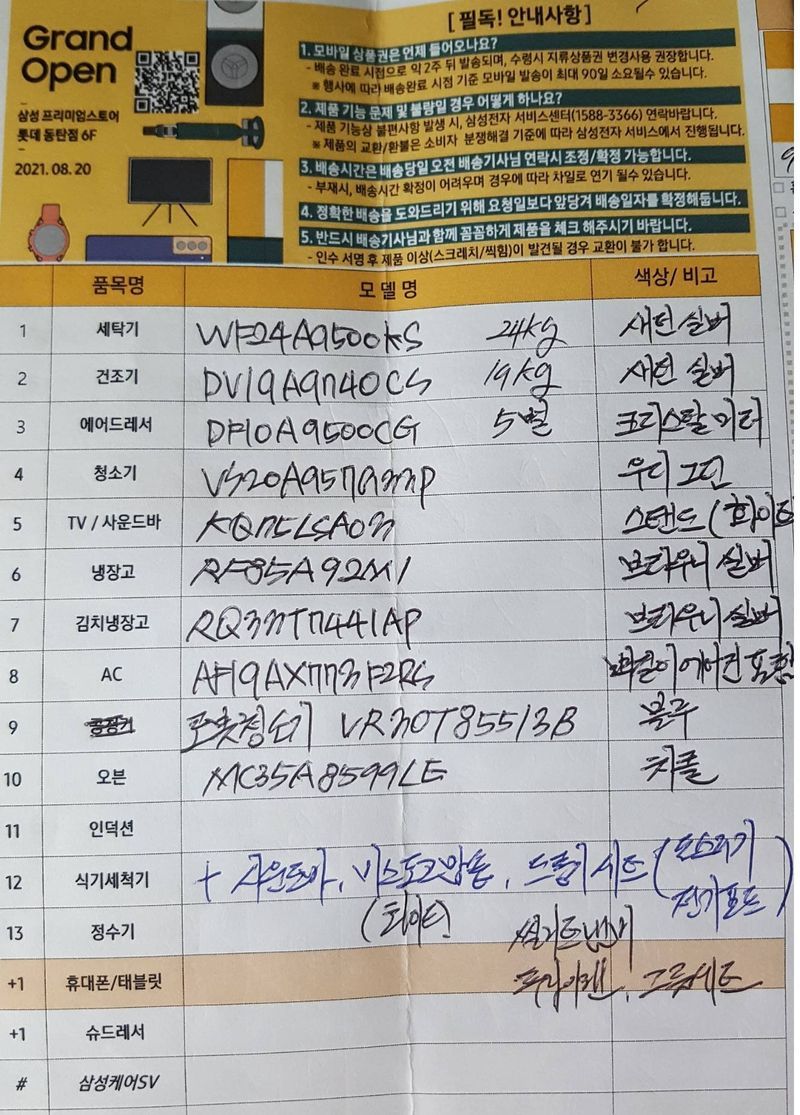 동탄점 인기가 많아 웨이팅이 가장 길었고 사전예약도 일찍마감되어서 현장대기후 상담받았어요. 그나마 웨이팅 시간이 짧은 오픈시간에 맞춰 일찍가세요. (TIP) 웨딩때 다른 것들처럼 일단 계약금 거는 건 줄 알고 체크카드 한도를 생각 못하고 그냥갔다가 주말에 한도가 안늘어나서 결제에 애를 먹었어요 ㅠㅠ 동탄 가실 때 농협/국민/롯데/현대 아무카드나 한도 신경쓰고 상담받으러 가세요! 그리고 동탄은 가장 마지막에 상담받으로 가시는 걸 추천드려요~ (견적은 저렴한데 상품전시가 몇개 없어요) 상품 : 추천♥ 냉장고 RF85A92M1 김치냉장고 RQ33T7441AP 세탁기 WF24A9500KS 건조기 DV19A9740CS 에어드레서 DF10A9500CG 청소기 VS20A957933P 로봇청소기 VR30T85513B TV KQ75LSA03 (사운드바 포함) 에어컨 AF19AX773FZRS 오븐 MC35A8599LE 사은품 : 밥솥, 드롱기세트, 냄비, 그릇세트, 후라이팬 가격 : 추천♥ 2545->1438만 (44%) 신혼에 잘 안하는 김치냉장고와 로봇청소기가 들어가고 인덕션이 빠지면서 할인율이 많이 크지는 않지만 오픈점만 비교해본 결과(롯백본점. 롯백분당. 롯백동탄. 디지털프라자 서초본점) 백화점이 결제가 깔끔했고 그중에 동탄이 가장 저렴했습니다. 동탄에서 구매시 삼성과 별개로 롯백 mvg 프레스티지 등급업 행사진행 중입니다. 서비스 : 추천♥ 다른지점에서 받은 견적서랑 품목 보여드리고 거기보다 저렴하게 해주려고 했고, 결제이후에도 좋은 추가 행사 있으면 따로 연락 주신다 했습니다.
