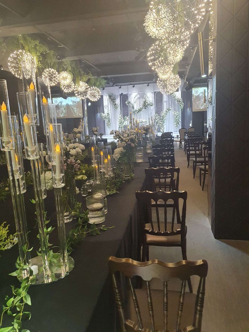 주차장외관 협소한 엘리베이터 2대 식있는날 방문했음에도 예식장느낌이없고 아무도없는 주차장느낌.... 엘베타고 올라가면 반전 밝은 로비와 넓고 채광좋은 신부대기실 민들레홀씨 조명이 이쁜 버진로드 홀분위기 : 추천♥ 사진과 정말 그대로에요! 민들레홀씨 조명과 버진로드 이뻐용 ㅎ 다만 의자가 목각의자..강당느낌? 불편해보이고 혼주석도... 기둥이 신경쓰이긴합니다 음식 : 보통♥ 못봐서 모르겟어요 연회장까진 계단으로 1층내려가요 서비스 : 보통♥ 무뚝뚝과 친절함의 중간? 외관과 엘베빼면 적당히 타협되서 계약할까 했지만 당일 계약 혜택도 없고, 담당자님 의지도 없어보여 일단 패스했어요 계약금은 200입니다