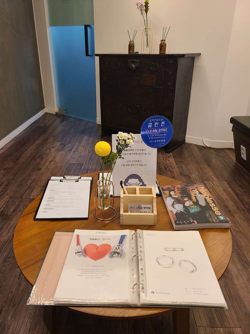 처음에 벨을 눌러야 안에서 문을 열어줘서 당황하고 입장; 큐알체크후 대기석에서 간단한 설문지 작성후 상담을 해요~ 디자인은 예쁘고 특이한것도 있었지만 가격이 너무 비싸다는 생각이 들었어요 4군데 투어했는데 그 중 가격만 봤을때 가장 위였네요~ 디자인 : 추천♥ 디자인 예쁘고 인스타에서 본것 보다 더 다양했던거 같아요 품질 : 가격은 저렴하진 않았고 품질은 비슷했어요 우신다이아몬드 등등..결제수단 부가세는 좀 당황스러웠어요. 서비스 : 1시예약인데 5분 늦게 도착. 안에서 10분이상 대기했어요; 유명한데라 그런지 정시도착했어도 앞타임이 안끈나서 대기했을듯한;; 꽤 많은 예신예랑분들이 상담중이었어요~