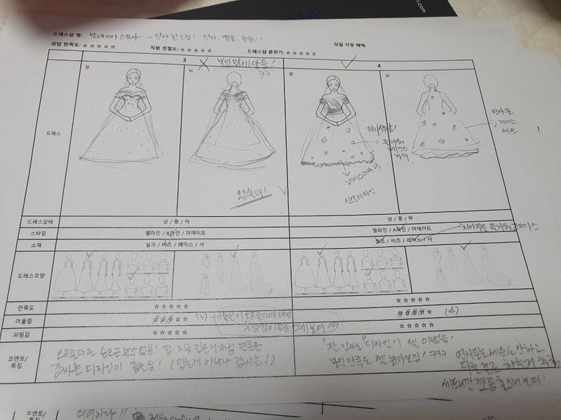 친구가 열심히 그려주고 메모해준 도안인데 요것만 봐도 제가 너무 맘에들어한게 느껴지더라구요ㅎㅎㅎ 스타일 : 추천♥ 제가 방문했던 3군데 샵중 가장 우아하고 고급스러웠어요! 샵 로비에 진영되어있던 드레스들도 너무 예뻐보였구요! 옷상태 : 추천♥ 드레스상태는...진짜 최상이었어요! 실크쪽은 전혀 생각안하고 디자인만보고 한번입어봣는데, 상태가 좋아서 더욱더예뻐보렸던것같아요ㅎㅎㅎ그래서 결국 실크드레스덕에 발레리아스포사로결정했습니다ㅎㅎㅎ 서비스 : 추천♥ 과하지않은 설명과 리액션이, 오히려 제 선택과 결정에 더 큰 도움을 주신 것같아요ㅎㅎㅎ 헤어악세사리와 귀걸이도 바꿔주실때마다 어울리게 설명도 곁들여주셔서 더 드레스가 예뻐보였습니다!