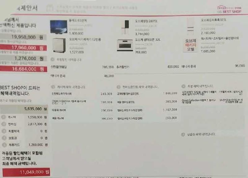 혼수할인+군인할인+작년모델tv라 더욱 저럼하게 구매 가능했던 점 참고 해 주세요^^ 상품 : 추천♥ 오브제 냉장고, 김치냉장고, 식기세척기, 워시타워, 스타일러5구, 광파오븐, 청소기, 올레드65인치 티비 가격 : 추천♥ 결제가 16684000원 체감가 11049000원 할인율 33-34% 인 것 같아요 서비스 : 추천♥ 사실 다른 곳에 견적을 잘 받았고 가계약을 걸고 나온 후 시장조사 겸 비대면 견적을 받은 곳은데 매니저님도 넘 친절하시고 락앤락 통 하나라도 더 챙겨주시려고 노력 해주시는 모습에 너무 감사 했어요. 할인율 바뀔 때 마다 연락 해주셔서 실제로 가계약 한달 후 정계약을 했는데 가계약 때보다 90만원 정도 더 떨어졌어요ㅎㅎㅎ