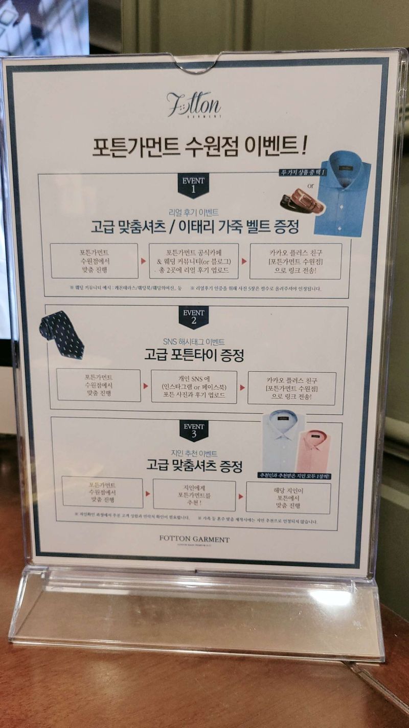급하게 대여복이 필요해서 급방문하게 됐는데 대여+예복 제작까지 가능하다고 하셨습니다 사실 대여복만 필요했는데 , 대여시 상의+하의 16500원라...... 예복 제작하면 대여복 2복이 무료라고 해서 맞춤으로 알아보기 시작했고 직원분께서 친절하게 알려주셨습니다 원단의 차이, 제작방법에 따른 차이점 직접 입어보면서 차이를 느낄수 있도록 해 주셨고 당일 계약시 수제화 할인 혜택이 있었습니다 최종 선택은 하지 않았지만 수원지역에 계시는 분들이라면 방문해보시길 추천합니당 상품 : 추천♥ 상의, 하의, 조끼, 셔츠1, 수제화, 대여2벌 ( 원단: 이태리) 가격 : 추천♥ 이태리원단(울 100프로, 드라고 원단) 가볍고 느낌도 좋았어요 영국원단은 무게감이 있더라구요 서비스 : 추천♥ 엄청 친절하셨어요 아무것도 몰라서 계속 물어봤는데 귀찮아하시지 않고 하나하나 차분하게 알려주셨어요