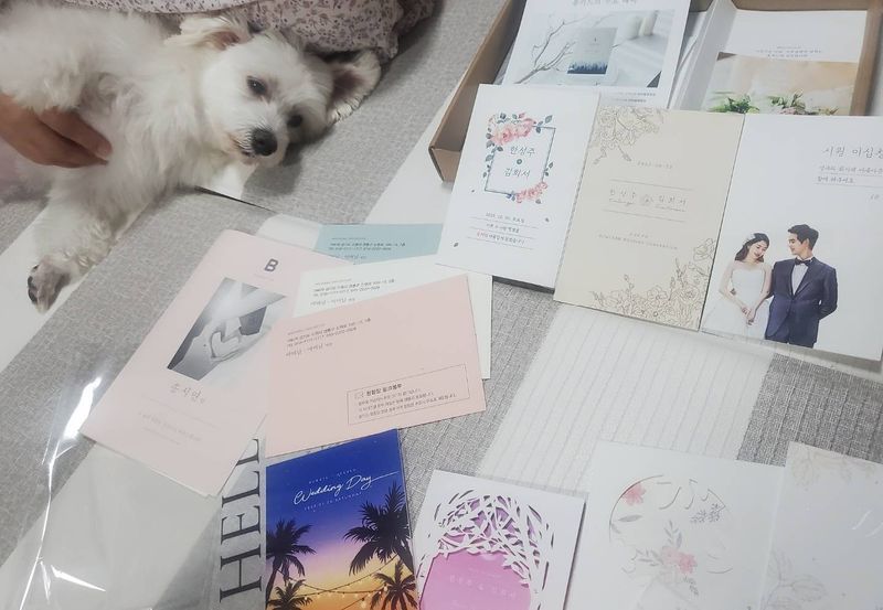 샘플신청 한 곳 중 제일 빠른날 도착. 개봉하는데 포장과 , 안에 담긴 유용한 내용물에 세심함과 정성을담으신것이 느껴져 개봉하는데 설렘. 아..나 정말 결혼하나봐🥰 두근두근 감정이 생겼다. 청첩장이라 다 이렇게 오나 싶어서 다른곳 샘플도 받고 검토 후 봄카드로 결정했다. 재질도 좋고, 펼쳐볼때 보기 편함 . 이쪽? 저쪽? 없이 왼쪽 오른쪽 또는 위 아래 로 펼칠수있는것도 세심했다. 종류도 다양. 샘플10장이 무료여도 딱 내 눈에 예쁜것 몇장만 골라서 신청해야지 했다. 다른곳에서 3장~4장 정도 샘플신청 . 봄카드는 다 예뻐 10장신청 ..근데 거의 다 맘에 들어서 몇날며칠 고민, ㅎ 가격도 합리적. 재질도 좋은데 가격도 단가가 비싼편은 아니다. 타 회사는 200매 기준 토탈 비용 1~ 2만원미만 저렴하지만 그만큼 접는 선 이라던지 종이 두께감 차이가 났으며, 특히 봉투 차이가 엄청났다. 무조건 봄카드 셀렉한 이유중 큰 비중 차지할정도로. 무료 샘플인데 이렇게나 정성스럽게 보내주셔서 감사해서 꼭 후기 잘쓰고싶었다. 타 큰 브랜드 보다 별점 밑에 있는게 아쉬울정도ㅜㅜ 꼭 봄카드 받아보세요. 예신예랑님들! 구성도 후회없을거에요! 리뷰 도움되시길♡ 디자인 : 추천♥ 종류도 다향하고 홈페이지도 보기 편하게 잘되어있어요 가격 : 추천♥ 샘플 신청한 3곳중에 이곳이 Top!! 서비스 : 추천♥ 같은날 비슷한시간어 샘플신청한 곳 중 가장 빠르게왔고, 포장조차 신경쓰고 준비된 회사느낌이 들어서 믿음이 가서 봄카드에서 제작결정했어요.