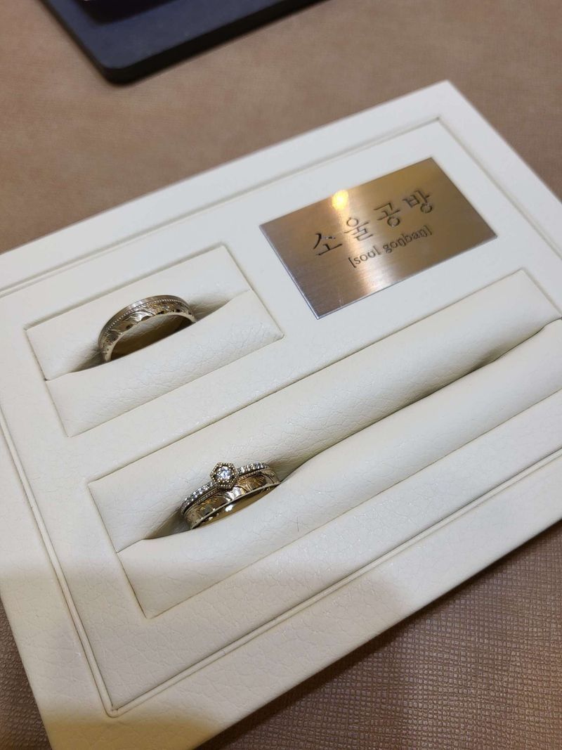 저는 예물 준비할 때 첨부터 원하는 방향이 있었는데요. 백화점 제품으로 보증된 품질로 준비하거나, 아예 디자인 위주로 내 맘에 쏙 드는 제품을 구입하자! 였어요. 티파니 티투랑 소울공방 반지를 고민하다가 공방반지로 최종픽했습니다. 티투는 스크래치나 알빠짐이 꽤 있다는 후기도 보았고, 매일 편하게 낄 반지를 찾고있는 제게 맞지않는단 느낌이 많이 들었어요. 예랑이는 괜찮다했지만 금액도 너무 비싸게 느껴졌구요. 티투 외 맘에 들었던 반지는 결혼용이 아닌 패션반지 느낌이 강했어요. 남들좋다는 쇼파드나 불가리는 제가 매력을 1도 못 느낌... 반면에 소울공방은 정교한 쉐입이 들어간 제품이 많았는데, 보통 회사간 카피제품이 많은데 여긴 다른데서 못보는 디자인이 있어서 맘에 쏙 들었습니다. 남자제품도 민자가 아니고 여성제품과 동일하게 디테일한 느낌이 좋았어요. 가드링과 레이어드했을 때 빛을 발하는 느낌도 취향저격이었습니다. 사장님께 직접 상담받았는데 여러 제품 추천해주시면서 내 취향도 알아가는 시간이 되어 좋았습니다. 사장님 너무 친절하시고, 예쁜 디자인도 많이 만들어주셔서... 모 주얼리샵처럼 곧 백화점에 입점할 그 날이 다가오지않을까싶어요. 흥하세요 사장님, 응원합니다😀 디자인 : 추천♥ 백화점 예물 전부 다 봤는데 확 끌리는 것도 없고, 리사이징되는 모델도 맘에 안들고... 진짜 예쁜건 신랑께 너무 별로였는데. 신랑신부가 예쁜 디자인으로 착용할 수 있는 샵입니다. 반지 안쪽이 곡면이라서 챡 감기는 맛도 있고. 외관도 특이하니 예뻐요. 반지 여러개 레이어드 하면 세상 예쁠 것같아요. 디자인이 중요하다 생각하시면 방문 추천합니다. 품질 : 추천♥ 예쁜 디자인으로 부담없이 편히 착용할 수 있어요. 공방에서 AS계속 받을 수도 있구요. 나중에 끼다가 디자인이 질리면 디자인 변경이나 리사이징 모두 가능합니다. 제품 수령일이 기다려집니다! 서비스 : 추천♥ 모든 디자인이 다예쁘지만 사장님이 진짜 성격 좋으세요. 예쁜 제품 만드는 안목도 있겠지만 사장님 믿고 계약했다고해도 과언이 아니에요. 인복많으실 것같아요. 너무 좋으셔서.