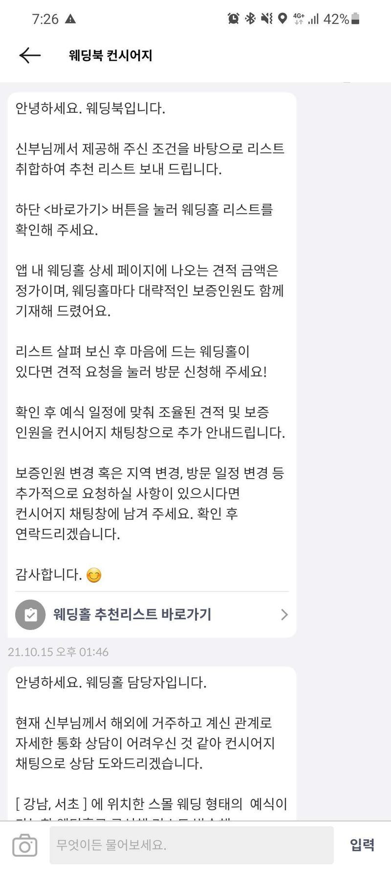 직접 방문이 어려워 비대면 상담신청을 해서 잘 진행이 될까 걱정했지만 충분히 만족할만한 진행을 할수있게 프로님께서 많이 도와주시고 웨딩북 컨시어지를 통해서도 많은 도움을 받았습니다. 처음에 아무것도 모르고 준비할때에는 웨딩북에서 보고 하나씩 알아가는게 정말 편한 것 같아요! 업체 : 추천♥ 웨딩북 비대면 상담을 이용해서 스드메를 계약했어요. 해외에서 준비 중이라 프로님께서 따로 연락을 주셔서 계약과 일정조율까지 잘 챙겨주셨어요. 가격 : 보통♥ 처음부터 예산을 알려드려서 예산내 업체들로 추천해주셨고 스드메 견적을 미리 해볼수있어서 좋았습니다 서비스 : 추천♥ 처음 스드메를 고민할때 많은 공감을 주신 프로님 덕에 위로를 받고 너무 어렵지않게 스드메결정도 빠르게 할 수 있었어요. 이것저것 부탁드릴때마다 피드백도 빠르게 주셔서 너무 만족했습니다!